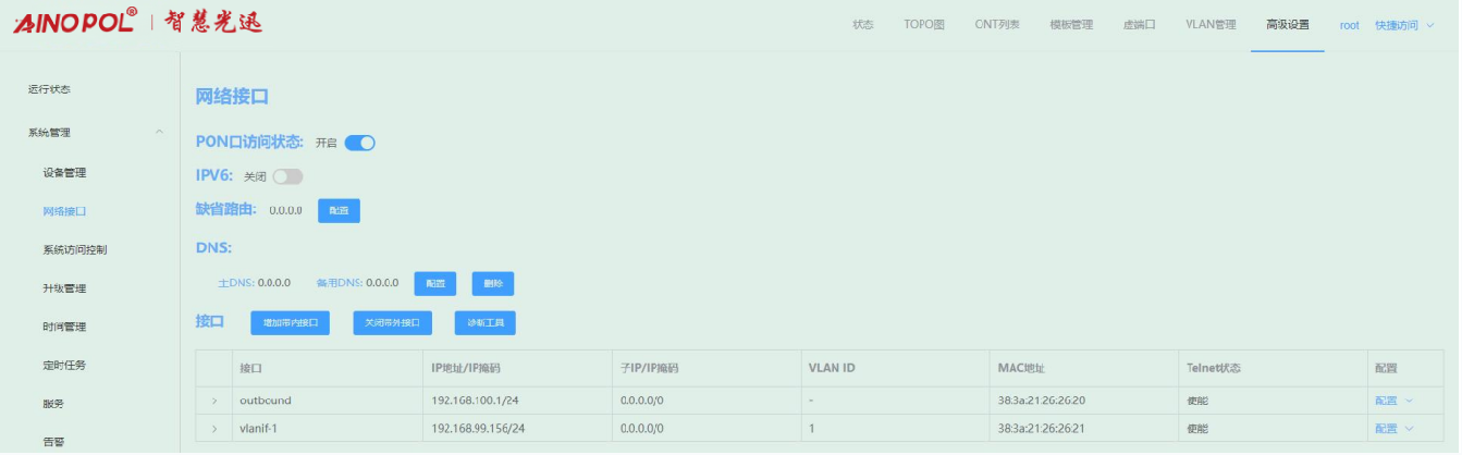 【产品教程】-基础 2026.04.01 盒式GPON 网络接口-PON 口访问状态 PON 口访问状态开启时可从 PON 侧访问 OLT 管理页面,PON 口访问状态默认开启。如下图所示: