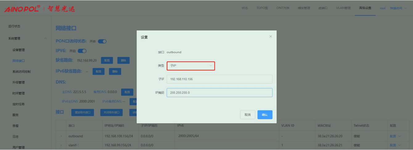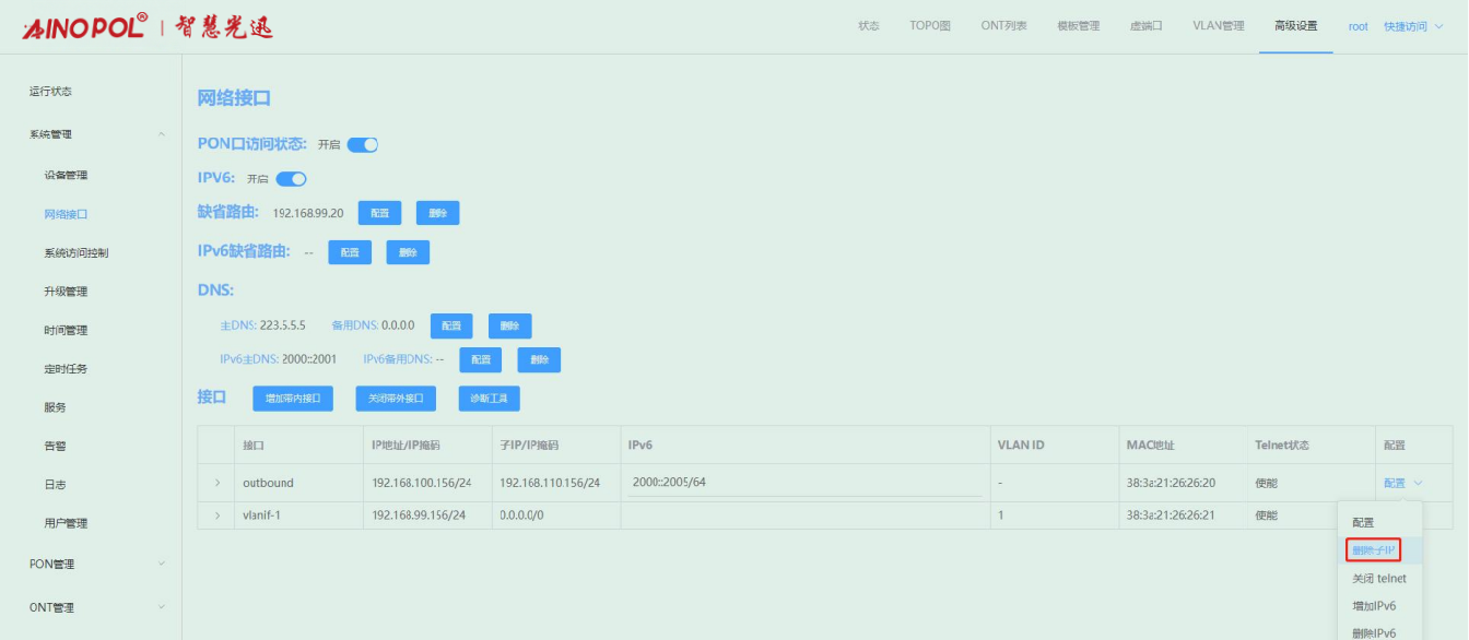 【产品教程】-基础 2026.04.01 盒式GPON 网络接口-配置带外管理子IP地址(仅支持修改,不支持增加和删除) 1、配置静态子 IP 接口(不能与 IPv4 接口同网段)  2、删除子IP地址