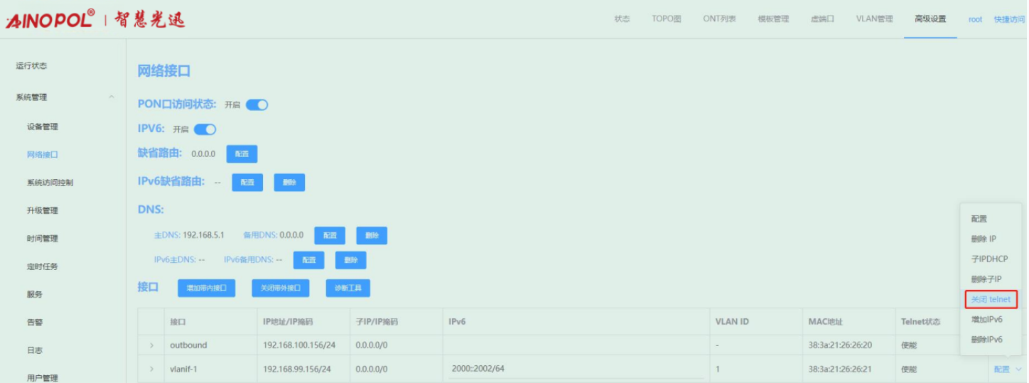 【产品教程】-基础 2026.04.01 盒式GPON 网络接口-带内管理口关闭和开启Telnet 功能 关闭和开启带内管理口的 Telnet 功能
