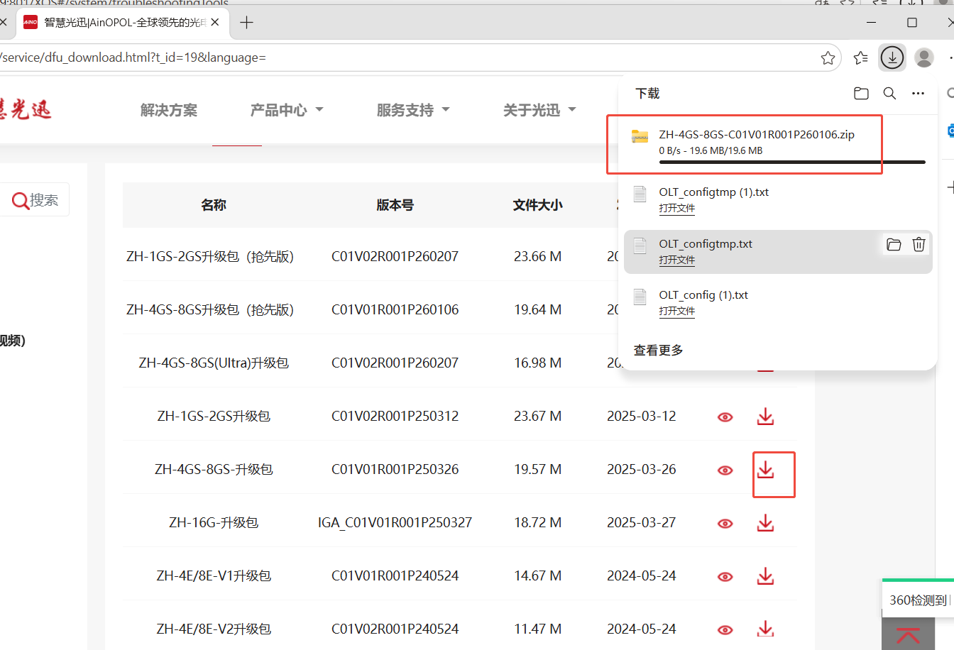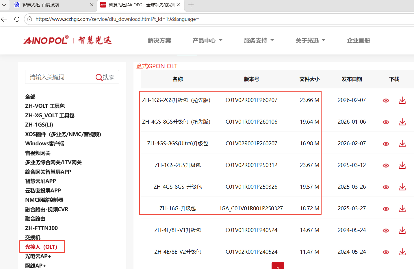 【产品教程】-基础 2026.04.01 盒式GPON 升级管理-设备升级包的获取 第一步,进入到咱们官网  第二步,进入到下载中心  第三步,根据当前的设备型号,下载对应的升级包升级  找到对应的最新版本升级包后,点击下载按钮即可下载
