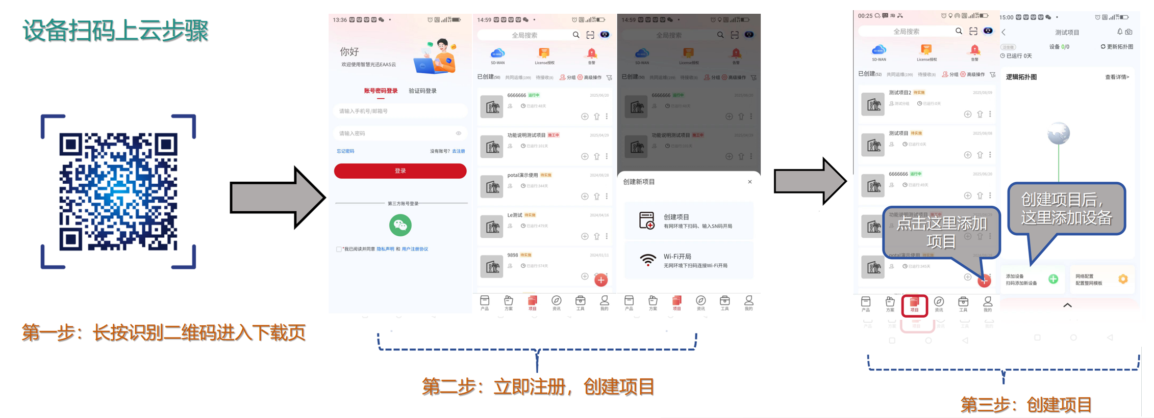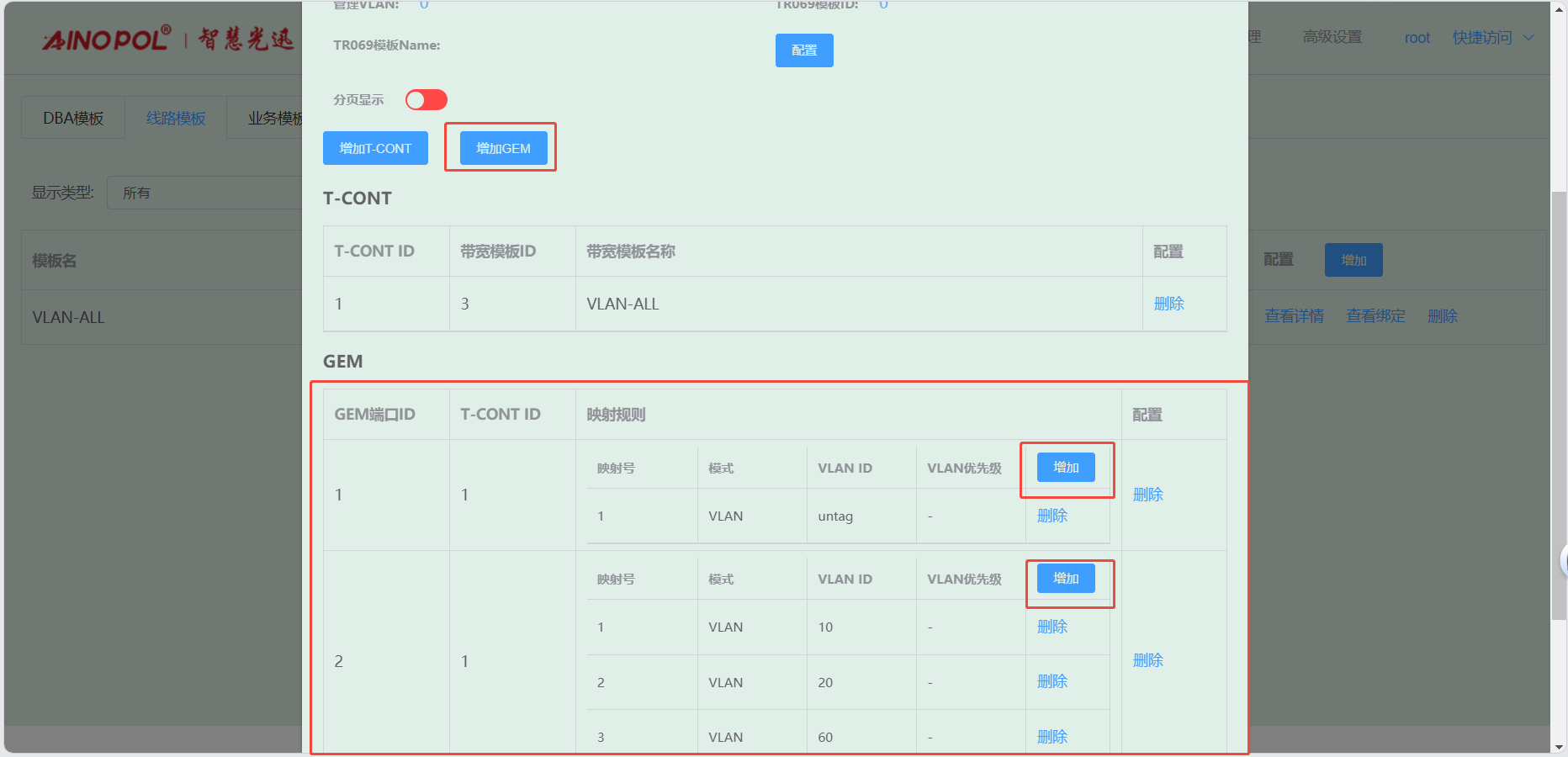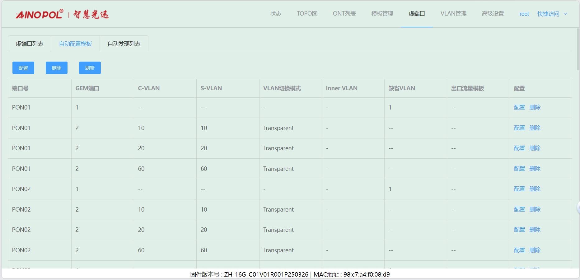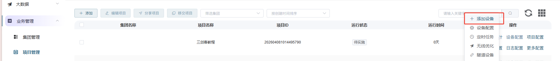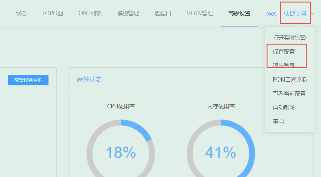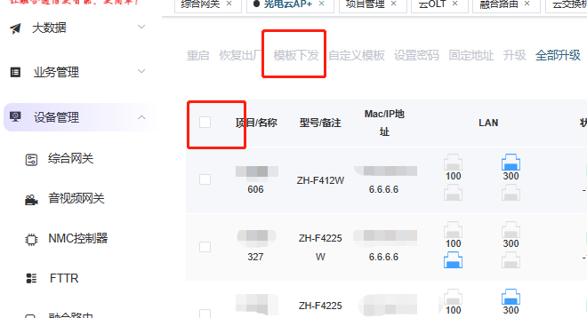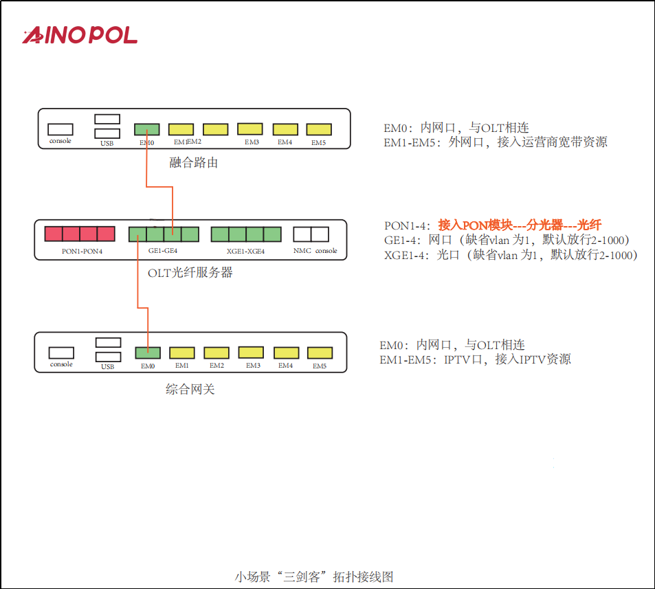 # **三剑客调试教程** 智慧光迅三剑客一般是指:融合路由、综合网关、OLT光接入设备。三剑客设备解决了项目需要的智寓、宾馆、养老院、月子中心等场景的一套解决方案。  ## 一、项目开局 ### 1、手机EAAS扫码上云 当我们的三剑客到手后先检查设备的完整性,确保该有的硬件一件不少,然后拿出我们的手机在应用商店下载EAAS云AP(即我们智慧光迅设备扫码上云以及云端维护平台),下载好后我们需要先注册自己的EAAS账号,以自己的手机号来注册,注意,创建项目的人为主账号,拥有项目的分享,移交,以及设备解绑等主要权限,被分享的人无以上权限,接下来我们根据下图步骤操作项目的创建、设备的绑定,若遇到问题则可以联系技术人员去做对应的技术处理  项目创建后可以分享给别人,让多人一起将设备扫码上云,具体步骤如下: 点进项目,下拉箭头找到分享项目,点击分享项目输入被分享人的手机号,注意被分享的人也要下载EAAS云APP并注册了账号的 ,且AP的名称以安装点位命名,需要注册电话号码的AP则以电话号码命名  手机云EAAS查看已添加设备,并远程设备进行管理  ### 2、电脑网页版EAAS上云 网页云EAAS(支持win系统)链接:[https://ztv.zhgxnet.cn/EAAS 网页云EAAS创建项目: 点击业务管理—项目管理,点击添加按钮:   网页云EAAS创建项目: 点击业务管理—项目管理,点击添加按钮:  填写项目名称(必填)、我的位置(必填)、网络配置(非必填)、选择设备(非必填); 点击完成  填写对应的设备编号,点击提交数据即可,注意AP最好以安装的点位命名,需要注册电话的话以电话号码命名(房间号命名,纯数字形式)  填写对应的设备编号,点击提交数据即可  网页云EAAS查看已添加设备,并进行管理:点击业务管理—项目管理—状态统计  设备全部上云后正常状态显示截图如下所示  ### 3、设备上架说明 (1)、将网络设备根据流量走向,从上到下进行设备安装,方便后期运维排查问题 (2)、两台设备之间至少空余1U,以保证设备的散热 (3)、布置网线时,网线长度需大于1米,短于100米。 (4)、强弱电布线时至少保持10cm以上,减少弱电网络传输时的干扰 (5)、OLT安装时一定要布置地线,以减少网络未接地造成的干扰 (6)、光纤布线时要注意不要过度弯折,尽量使用魔术贴进行理线避免光纤折损 (7)、分光时切记分光均匀,光过强(不宜高于\-10DB)、光过弱(不宜低于-25DB)、光差值过大(同一个PON下ONU接收的光值不超过10DB)都容易导致网络不稳定 ### 4、机房接线示意图  ## 二、设备调试上网 ### 1、融合路由调试上网 第一步:电脑接到融合路由的EM1(ETH1、LAN1)口,自动获取IPv 4的地址,根据获取的地址网页访问网关,进入路由的登入界面,输入默认密码Zhgxnet@123进入路由的主页,接口设置--LAN设置,设置LAN口,设置内网IP以及掩码(默认IP地址为10.8.8.1.掩码为255.255.252.0) 点击接口管理—LAN设置—LAN设置—配置  第二步:设置端口IP、掩码、DHCP地址池以及地址租期(保留10.8.8.X段做为管理设备的静态IP),注意一定要下拉高级设置将DNS改为外网提供的DNS,没有的话填223.5.5.5,114.114.114.114  第三步:WAN口的分配 点击接口管理—接口设置,根据需求进行WAN口的分配(默认1LAN/5WAN)或者在接口管理更改线路,注意更改后需要点保存才会生效  或者  第四步:设置WAN口,选择上网类型,进行外网的接入 点击接口管理—WAN设置—WAN设置,点击右侧配置按钮  第五步:根据运营商所给的外网接入类型选择对应情况并填写对应信息  ### 2、融合路由内网规划 第一步:业务网络规划 | 业务网络规划举例  第二步:针对规划的网段创建对应的LAN口  第三步:针对详细的业务规划依次创建,创建完成的详细截图如下所示:  ### 3、 OLT设备调试上网 第一步:进入设备调试界面 OLT的NMS口IP为192.168.100.1,或者直连的网口OLT默认出厂IP(VLANIF1)是:10.8.8.6/22,电脑设置同网段静态IP即可进入 第二步:OLT配置上网 点击高级设置—系统管理—接口—vlanif1—配置,即可配置OLT的IP地址 EPON  GPON  第三步:配置vlanif 1 ip地址、缺省路由IP(网关)、DNS  第四步:配置业务模板,(注意业务模板在4GS、8GS、16G一定要做,其他型号可以使用默认的全透传模板(即即插即用),且默认的是透传1-1000VLAN,超过的需要收到加一下)模板管理--线路模板--查看详情,将全透传的模板GEM1删除,保存再点击查看详情,点击增加GEM,GEM1,选择untag,点击确定,再创建一个GEM2,在GEM2增加映射VLAN,即内网需要通过的VLANID,入下图所示:     第五步,匹配虚接口,点击虚接口,点击自动匹配模板,先点击删除,删除所有,点击添加,端口选择所有,GEM1缺省VLAN1,其他不关注,点击确认,配置缺省VLAN,再点击添加,端口选择需要过对应业务的VLAN端口,填对应的信息,C-VLAN和S-VLAN填对应需要过的业务VLAN,每一条都要单独配置,      注意配置完成需要在快捷访问这里保存配置  第六步,查看ONU的注册情况,点击OUN列表可以查看全部ONU的注册详情  第七步,开启P2P,若需使得PON口下的终端设备可以互通则需要打开P2P,点击系统设置PON管理--PON设置,对应PON口的P2P打开即可  第八步,关闭隔离组,若需不通PON口下的终端设备可以互通需要将我们隔离组成员删除,点击系统设置的端口管理--端口组,点击PON端口隔离的配置,全部不选,点击确认即可   ### 4、综合网关调试上网 综合网关EM0口IP默认为10.8.8.200,可以接入EM1口设置同网段IP进行设备调试 (EM1-EM5口默认出货IP为:192.168.101.1-192.168.105.1) 