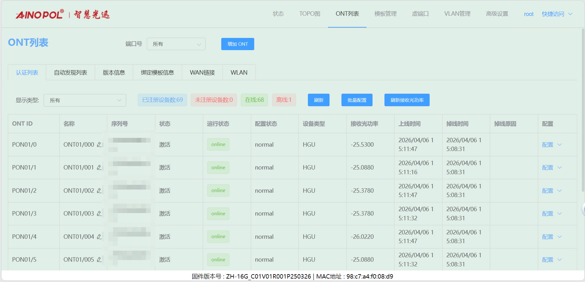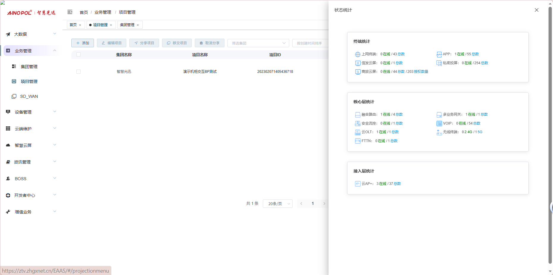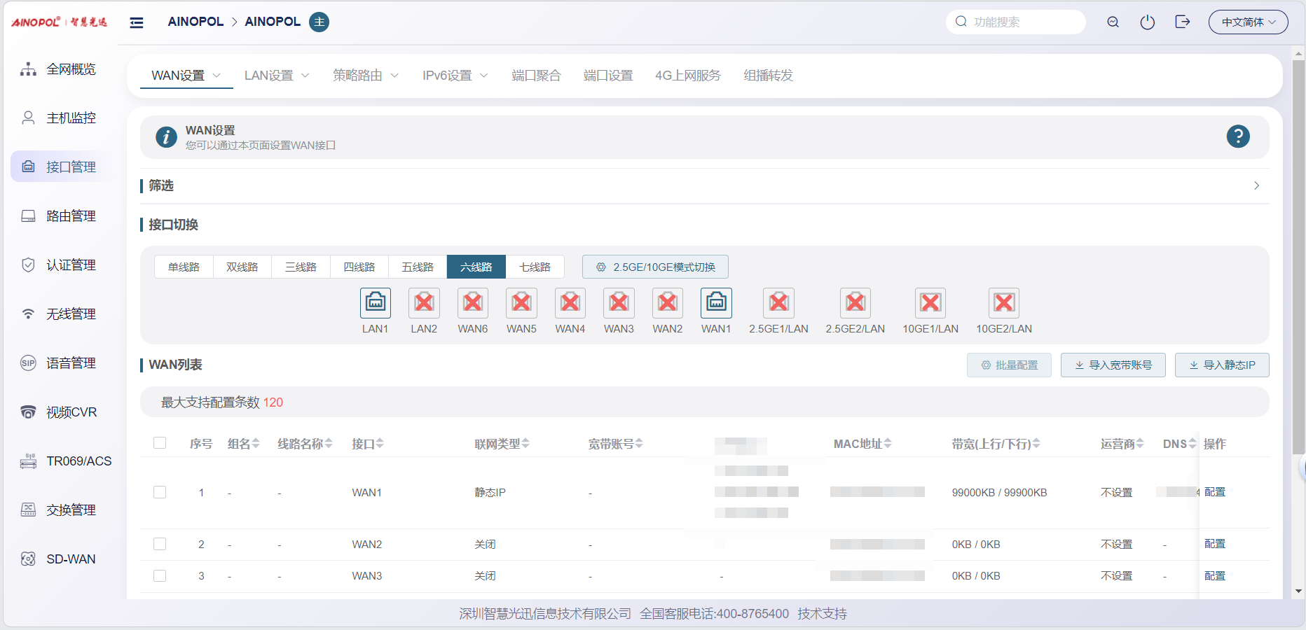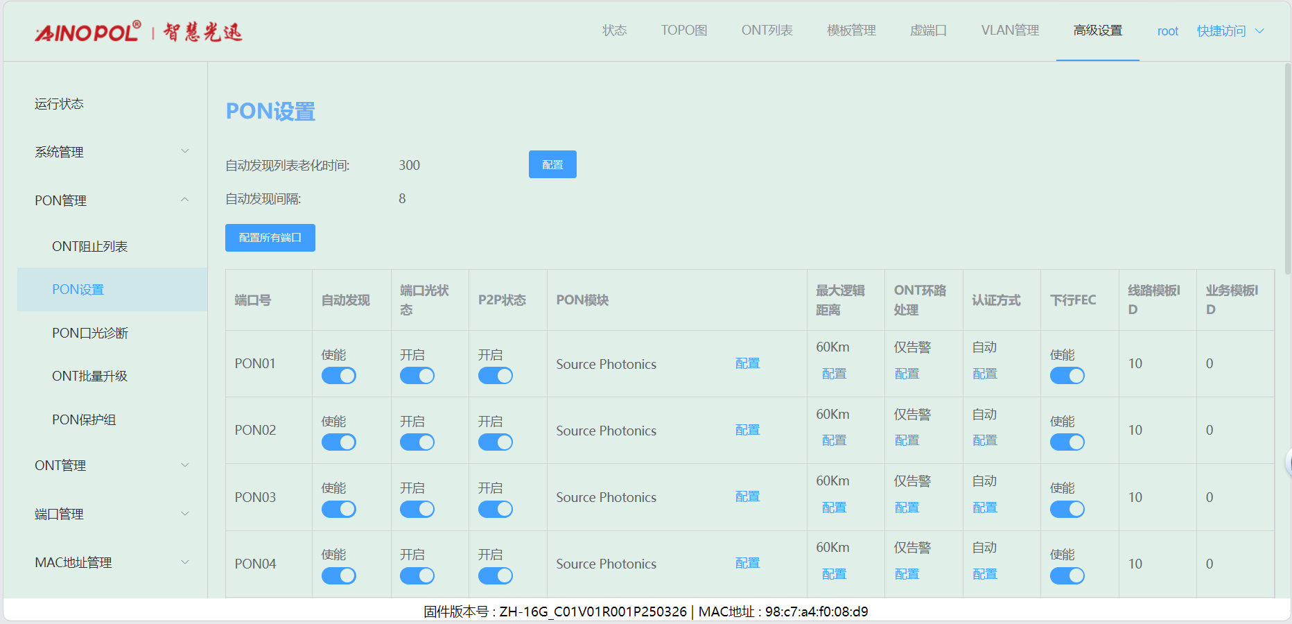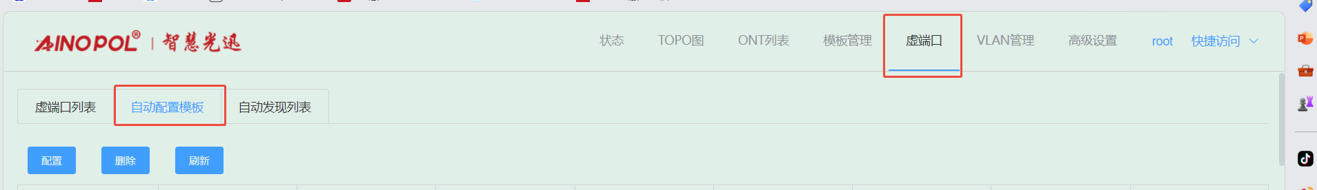 # **三剑客调试教程** 智慧光迅三剑客一般是指:融合路由、综合网关、OLT光接入设备。三剑客设备解决了项目需要的智寓、宾馆、养老院、月子中心等场景的一套解决方案。  ## 一、项目开局 ### 1、手机EAAS扫码上云 当我们的三剑客到手后先检查设备的完整性,确保该有的硬件一件不少,然后拿出我们的手机在应用商店下载EAAS云AP(即我们智慧光迅设备扫码上云以及云端维护平台),下载好后我们需要先注册自己的EAAS账号,以自己的手机号来注册,注意,创建项目的人为主账号,拥有项目的分享,移交,以及设备解绑等主要权限,被分享的人无以上权限,接下来我们根据下图步骤操作项目的创建、设备的绑定,若遇到问题则可以联系技术人员去做对应的技术处理  项目创建后可以分享给别人,让多人一起将设备扫码上云,具体步骤如下: 点进项目,下拉箭头找到分享项目,点击分享项目输入被分享人的手机号,注意被分享的人也要下载EAAS云APP并注册了账号的 ,且AP的名称以安装点位命名,需要注册电话号码的AP则以电话号码命名  手机云EAAS查看已添加设备,并远程设备进行管理  ### 2、电脑网页版EAAS上云 网页云EAAS(支持win系统)链接:[https://ztv.zhgxnet.cn/EAAS 网页云EAAS创建项目: 点击业务管理—项目管理,点击添加按钮:   网页云EAAS创建项目: 点击业务管理—项目管理,点击添加按钮:  填写项目名称(必填)、我的位置(必填)、网络配置(非必填)、选择设备(非必填); 点击完成  填写对应的设备编号,点击提交数据即可,注意AP最好以安装的点位命名,需要注册电话的话以电话号码命名(房间号命名,纯数字形式)  填写对应的设备编号,点击提交数据即可  网页云EAAS查看已添加设备,并进行管理:点击业务管理—项目管理—状态统计  设备全部上云后正常状态显示截图如下所示  ### 3、设备上架说明 (1)、将网络设备根据流量走向,从上到下进行设备安装,方便后期运维排查问题 (2)、两台设备之间至少空余1U,以保证设备的散热 (3)、布置网线时,网线长度需大于1米,短于100米。 (4)、强弱电布线时至少保持10cm以上,减少弱电网络传输时的干扰 (5)、OLT安装时一定要布置地线,以减少网络未接地造成的干扰 (6)、光纤布线时要注意不要过度弯折,尽量使用魔术贴进行理线避免光纤折损 (7)、分光时切记分光均匀,光过强(不宜高于\-10DB)、光过弱(不宜低于-25DB)、光差值过大(同一个PON下ONU接收的光值不超过10DB)都容易导致网络不稳定 ### 4、机房接线示意图  ## 二、设备调试上网 ### 1、融合路由调试上网 第一步:电脑接到融合路由的EM1(ETH1、LAN1)口,自动获取IPv 4的地址,根据获取的地址网页访问网关,进入路由的登入界面,输入默认密码Zhgxnet@123进入路由的主页,接口设置--LAN设置,设置LAN口,设置内网IP以及掩码(默认IP地址为10.8.8.1.掩码为255.255.252.0) 点击接口管理—LAN设置—LAN设置—配置  第二步:设置端口IP、掩码、DHCP地址池以及地址租期(保留10.8.8.X段做为管理设备的静态IP),注意一定要下拉高级设置将DNS改为外网提供的DNS,没有的话填223.5.5.5,114.114.114.114  第三步:WAN口的分配 点击接口管理—接口设置,根据需求进行WAN口的分配(默认1LAN/5WAN)或者在接口管理更改线路,注意更改后需要点保存才会生效  或者  第四步:设置WAN口,选择上网类型,进行外网的接入 点击接口管理—WAN设置—WAN设置,点击右侧配置按钮  第五步:根据运营商所给的外网接入类型选择对应情况并填写对应信息  ### 2、融合路由内网规划 第一步:业务网络规划 | 业务网络规划举例  第二步:针对规划的网段创建对应的LAN口  第三步:针对详细的业务规划依次创建,创建完成的详细截图如下所示:  ### 3、 OLT设备调试上网 第一步:进入设备调试界面 OLT的NMS口IP为192.168.100.1,或者直连的网口OLT默认出厂IP(VLANIF1)是:10.8.8.6/22,电脑设置同网段静态IP即可进入 第二步:OLT配置上网 点击高级设置—系统管理—接口—vlanif1—配置,即可配置OLT的IP地址 EPON  GPON  第三步:配置vlanif 1 ip地址、缺省路由IP(网关)、DNS  第四步:配置业务模板,(注意业务模板在4GS、8GS、16G一定要做,其他型号可以使用默认的全透传模板(即即插即用),且默认的是透传1-1000VLAN,超过的需要收到加一下)模板管理--线路模板--查看详情,将全透传的模板GEM1删除,保存再点击查看详情,点击增加GEM,GEM1,选择untag,点击确定,再创建一个GEM2,在GEM2增加映射VLAN,即内网需要通过的VLANID,入下图所示:     第五步,匹配虚接口,点击虚接口,点击自动匹配模板,先点击删除,删除所有,点击添加,端口选择所有,GEM1缺省VLAN1,其他不关注,点击确认,配置缺省VLAN,再点击添加,端口选择需要过对应业务的VLAN端口,填对应的信息,C-VLAN和S-VLAN填对应需要过的业务VLAN,每一条都要单独配置,      注意配置完成需要在快捷访问这里保存配置  第六步,查看ONU的注册情况,点击OUN列表可以查看全部ONU的注册详情  第七步,开启P2P,若需使得PON口下的终端设备可以互通则需要打开P2P,点击系统设置PON管理--PON设置,对应PON口的P2P打开即可  第八步,关闭隔离组,若需不通PON口下的终端设备可以互通需要将我们隔离组成员删除,点击系统设置的端口管理--端口组,点击PON端口隔离的配置,全部不选,点击确认即可   ### 4、综合网关调试上网 综合网关EM0口IP默认为10.8.8.200,可以接入EM1口设置同网段IP进行设备调试 (EM1-EM5口默认出货IP为:192.168.101.1-192.168.105.1) 