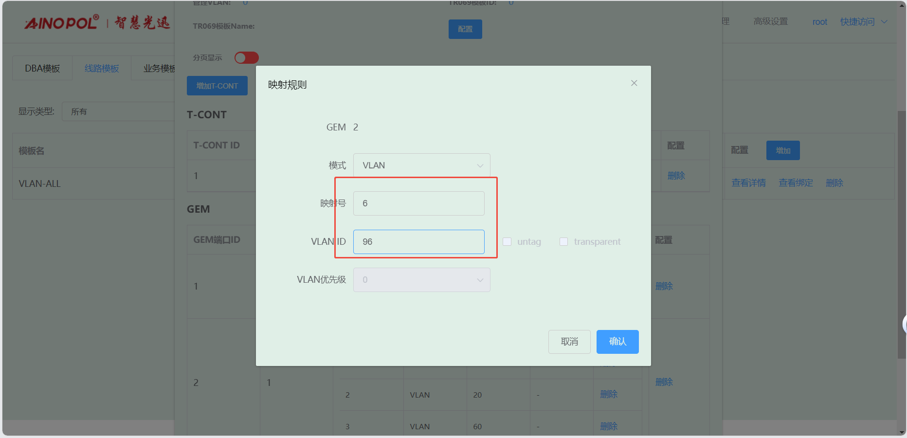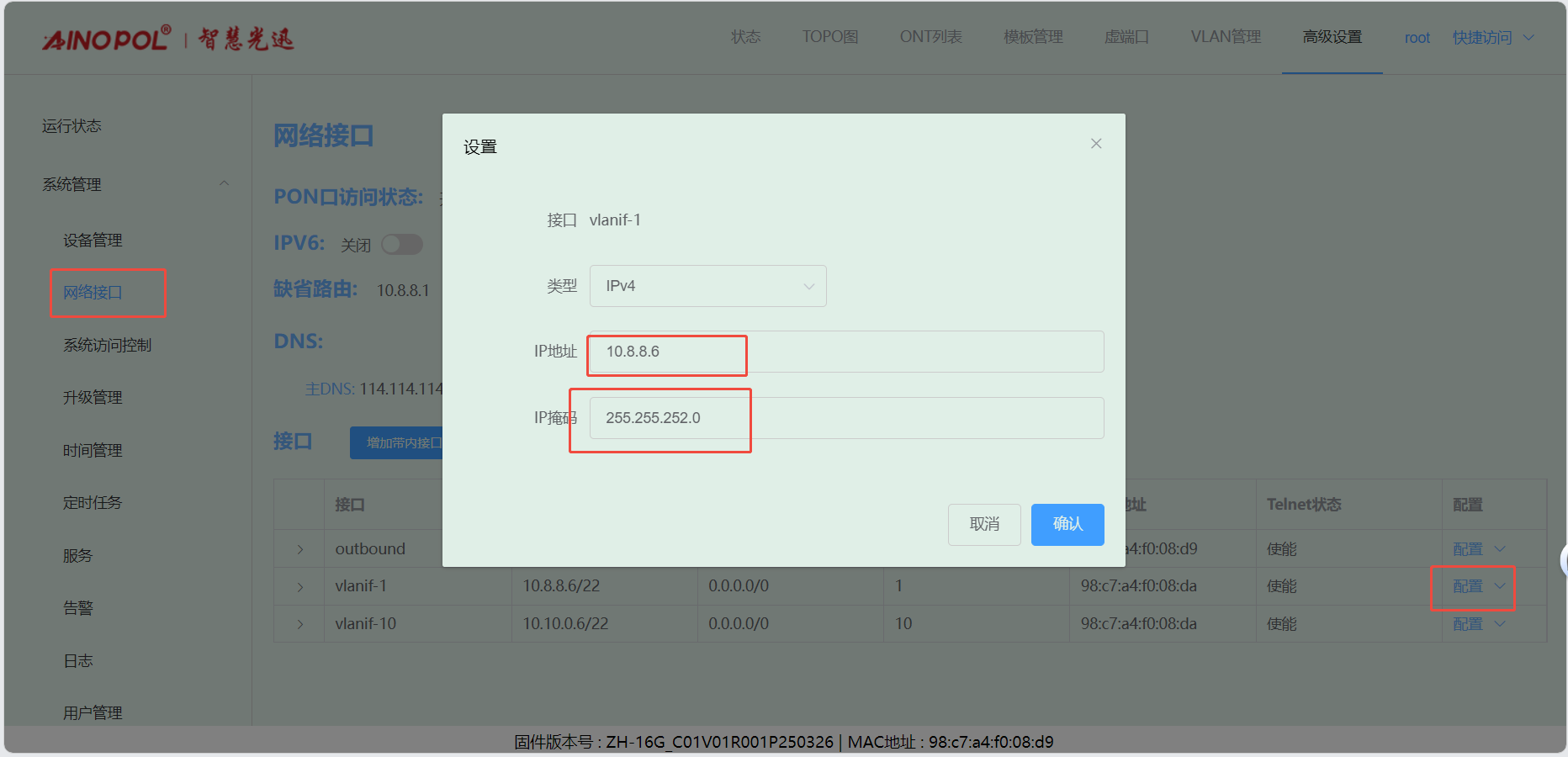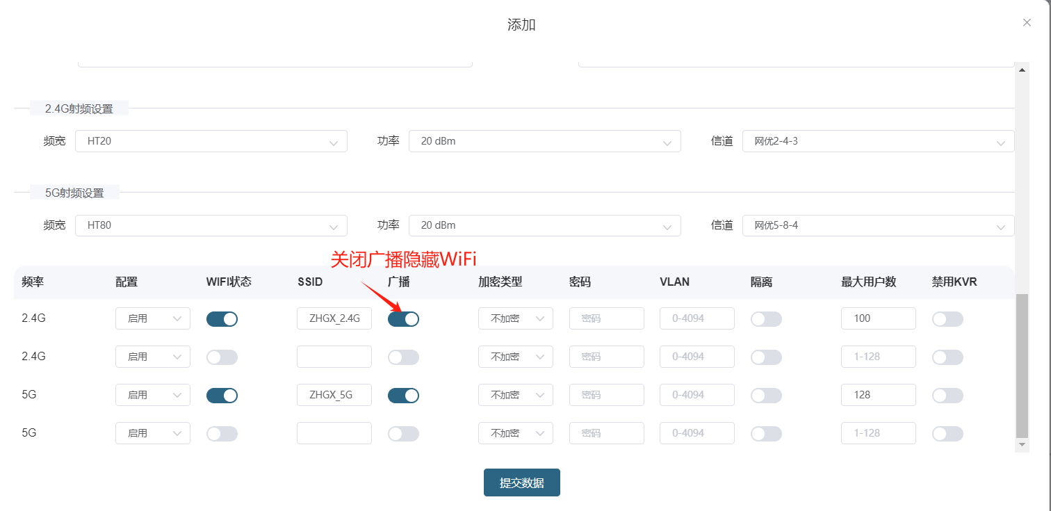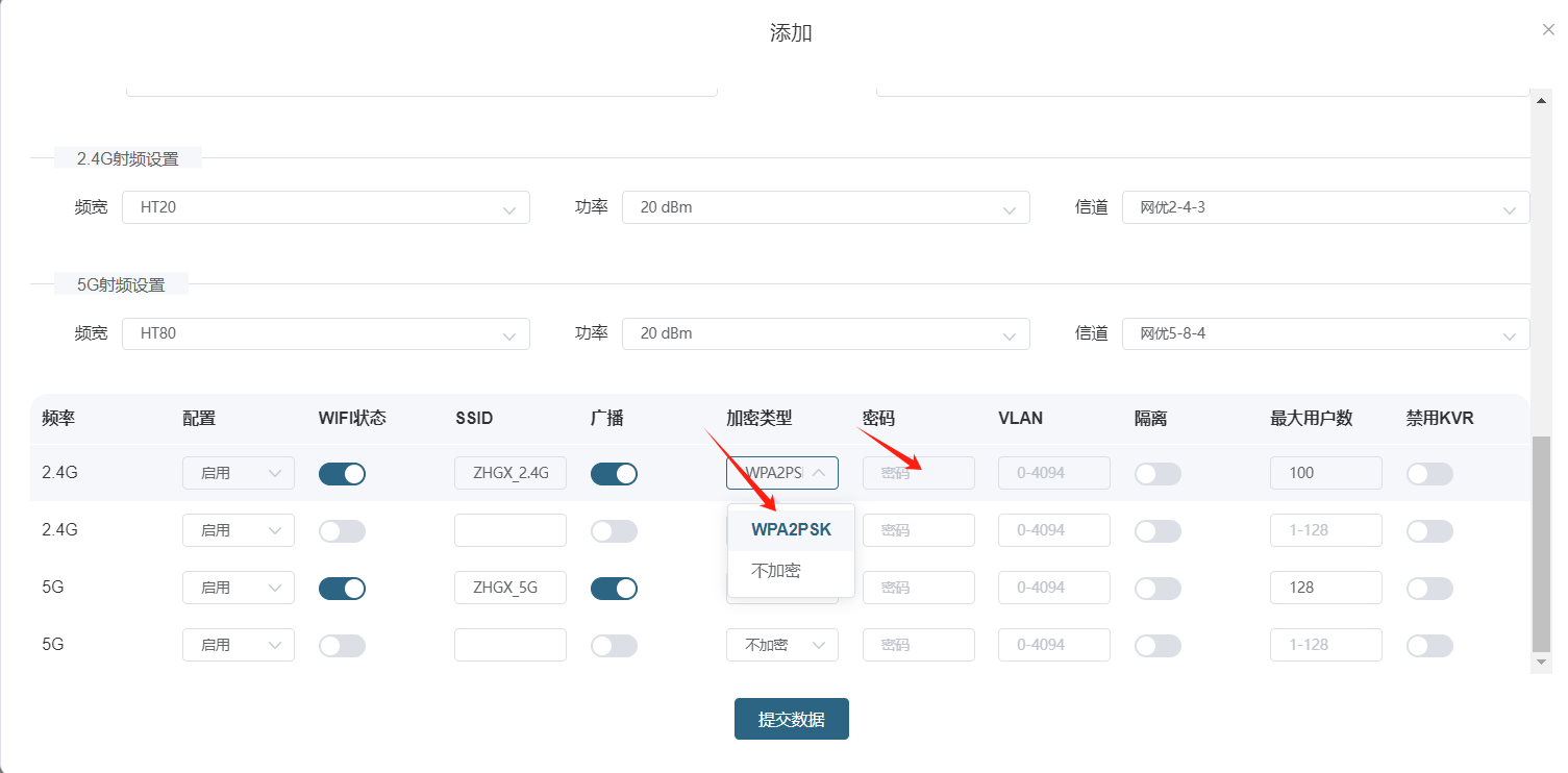 # **三剑客调试教程** 智慧光迅三剑客一般是指:融合路由、综合网关、OLT光接入设备。三剑客设备解决了项目需要的智寓、宾馆、养老院、月子中心等场景的一套解决方案。  ## 一、项目开局 ### 1、手机EAAS扫码上云 当我们的三剑客到手后先检查设备的完整性,确保该有的硬件一件不少,然后拿出我们的手机在应用商店下载EAAS云AP(即我们智慧光迅设备扫码上云以及云端维护平台),下载好后我们需要先注册自己的EAAS账号,以自己的手机号来注册,注意,创建项目的人为主账号,拥有项目的分享,移交,以及设备解绑等主要权限,被分享的人无以上权限,接下来我们根据下图步骤操作项目的创建、设备的绑定,若遇到问题则可以联系技术人员去做对应的技术处理  项目创建后可以分享给别人,让多人一起将设备扫码上云,具体步骤如下: 点进项目,下拉箭头找到分享项目,点击分享项目输入被分享人的手机号,注意被分享的人也要下载EAAS云APP并注册了账号的 ,且AP的名称以安装点位命名,需要注册电话号码的AP则以电话号码命名  手机云EAAS查看已添加设备,并远程设备进行管理  ### 2、电脑网页版EAAS上云 网页云EAAS(支持win系统)链接:[https://ztv.zhgxnet.cn/EAAS 网页云EAAS创建项目: 点击业务管理—项目管理,点击添加按钮:   网页云EAAS创建项目: 点击业务管理—项目管理,点击添加按钮:  填写项目名称(必填)、我的位置(必填)、网络配置(非必填)、选择设备(非必填); 点击完成  填写对应的设备编号,点击提交数据即可,注意AP最好以安装的点位命名,需要注册电话的话以电话号码命名(房间号命名,纯数字形式)  填写对应的设备编号,点击提交数据即可  网页云EAAS查看已添加设备,并进行管理:点击业务管理—项目管理—状态统计  设备全部上云后正常状态显示截图如下所示  ### 3、设备上架说明 (1)、将网络设备根据流量走向,从上到下进行设备安装,方便后期运维排查问题 (2)、两台设备之间至少空余1U,以保证设备的散热 (3)、布置网线时,网线长度需大于1米,短于100米。 (4)、强弱电布线时至少保持10cm以上,减少弱电网络传输时的干扰 (5)、OLT安装时一定要布置地线,以减少网络未接地造成的干扰 (6)、光纤布线时要注意不要过度弯折,尽量使用魔术贴进行理线避免光纤折损 (7)、分光时切记分光均匀,光过强(不宜高于\-10DB)、光过弱(不宜低于-25DB)、光差值过大(同一个PON下ONU接收的光值不超过10DB)都容易导致网络不稳定 ### 4、机房接线示意图  ## 二、设备调试上网 ### 1、融合路由调试上网 第一步:电脑接到融合路由的EM1(ETH1、LAN1)口,自动获取IPv 4的地址,根据获取的地址网页访问网关,进入路由的登入界面,输入默认密码Zhgxnet@123进入路由的主页,接口设置--LAN设置,设置LAN口,设置内网IP以及掩码(默认IP地址为10.8.8.1.掩码为255.255.252.0) 点击接口管理—LAN设置—LAN设置—配置  第二步:设置端口IP、掩码、DHCP地址池以及地址租期(保留10.8.8.X段做为管理设备的静态IP),注意一定要下拉高级设置将DNS改为外网提供的DNS,没有的话填223.5.5.5,114.114.114.114  第三步:WAN口的分配 点击接口管理—接口设置,根据需求进行WAN口的分配(默认1LAN/5WAN)或者在接口管理更改线路,注意更改后需要点保存才会生效  或者  第四步:设置WAN口,选择上网类型,进行外网的接入 点击接口管理—WAN设置—WAN设置,点击右侧配置按钮  第五步:根据运营商所给的外网接入类型选择对应情况并填写对应信息  ### 2、融合路由内网规划 第一步:业务网络规划 | 业务网络规划举例  第二步:针对规划的网段创建对应的LAN口  第三步:针对详细的业务规划依次创建,创建完成的详细截图如下所示:  ### 3、 OLT设备调试上网 第一步:进入设备调试界面 OLT的NMS口IP为192.168.100.1,或者直连的网口OLT默认出厂IP(VLANIF1)是:10.8.8.6/22,电脑设置同网段静态IP即可进入 第二步:OLT配置上网 点击高级设置—系统管理—接口—vlanif1—配置,即可配置OLT的IP地址 EPON  GPON  第三步:配置vlanif 1 ip地址、缺省路由IP(网关)、DNS  第四步:配置业务模板,(注意业务模板在4GS、8GS、16G一定要做,其他型号可以使用默认的全透传模板(即即插即用),且默认的是透传1-1000VLAN,超过的需要收到加一下)模板管理--线路模板--查看详情,将全透传的模板GEM1删除,保存再点击查看详情,点击增加GEM,GEM1,选择untag,点击确定,再创建一个GEM2,在GEM2增加映射VLAN,即内网需要通过的VLANID,入下图所示:     第五步,匹配虚接口,点击虚接口,点击自动匹配模板,先点击删除,删除所有,点击添加,端口选择所有,GEM1缺省VLAN1,其他不关注,点击确认,配置缺省VLAN,再点击添加,端口选择需要过对应业务的VLAN端口,填对应的信息,C-VLAN和S-VLAN填对应需要过的业务VLAN,每一条都要单独配置,      注意配置完成需要在快捷访问这里保存配置  第六步,查看ONU的注册情况,点击OUN列表可以查看全部ONU的注册详情  第七步,开启P2P,若需使得PON口下的终端设备可以互通则需要打开P2P,点击系统设置PON管理--PON设置,对应PON口的P2P打开即可  第八步,关闭隔离组,若需不通PON口下的终端设备可以互通需要将我们隔离组成员删除,点击系统设置的端口管理--端口组,点击PON端口隔离的配置,全部不选,点击确认即可   ### 4、综合网关调试上网 综合网关EM0口IP默认为10.8.8.200,可以接入EM1口设置同网段IP进行设备调试 (EM1-EM5口默认出货IP为:192.168.101.1-192.168.105.1) 