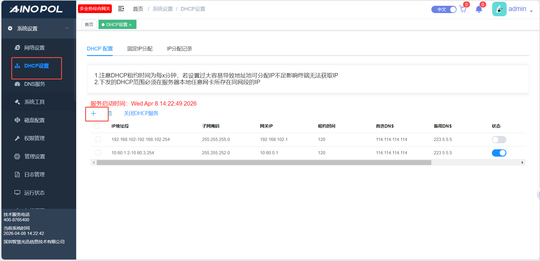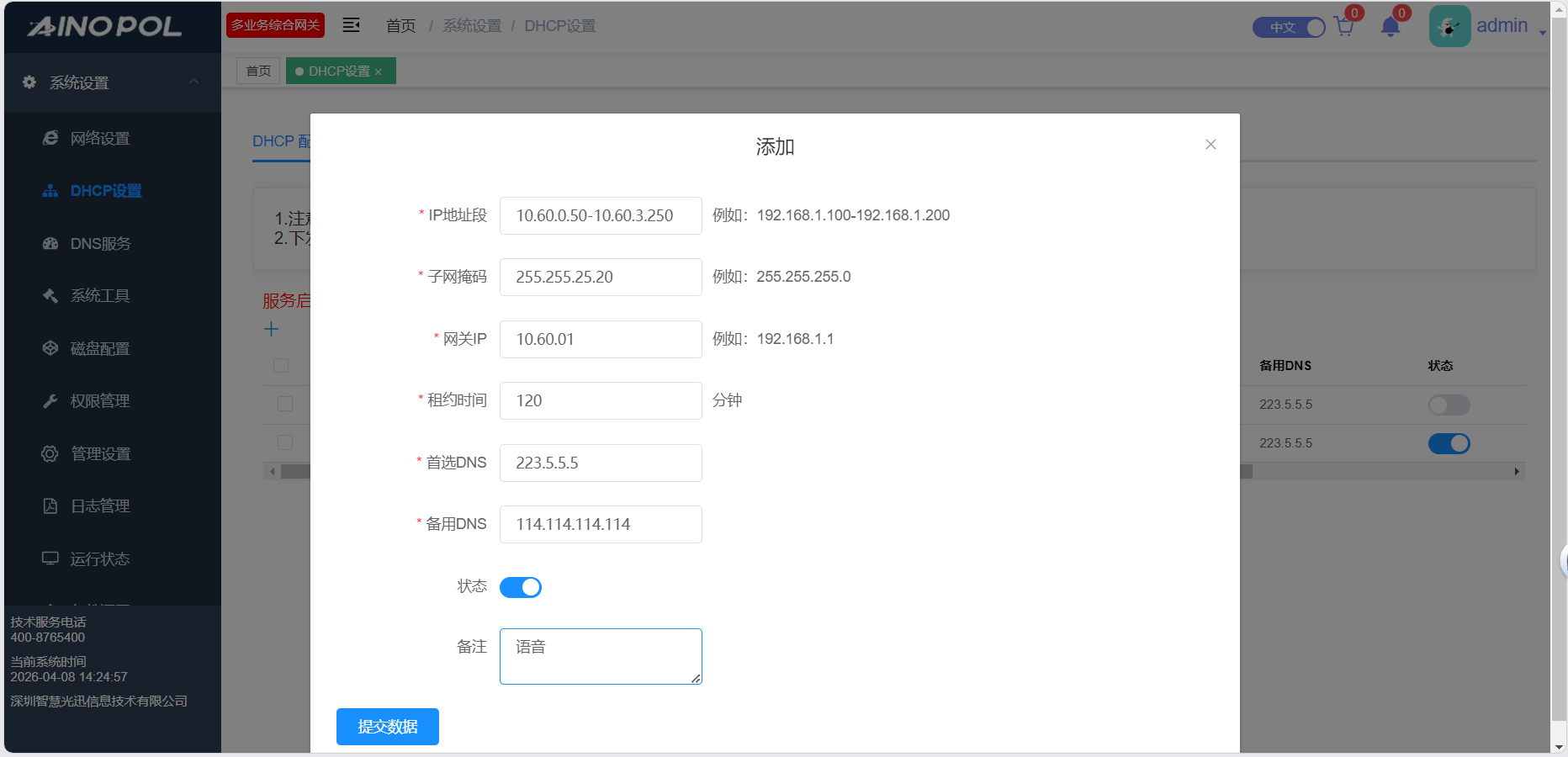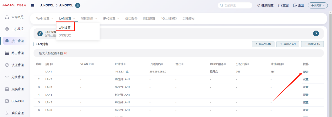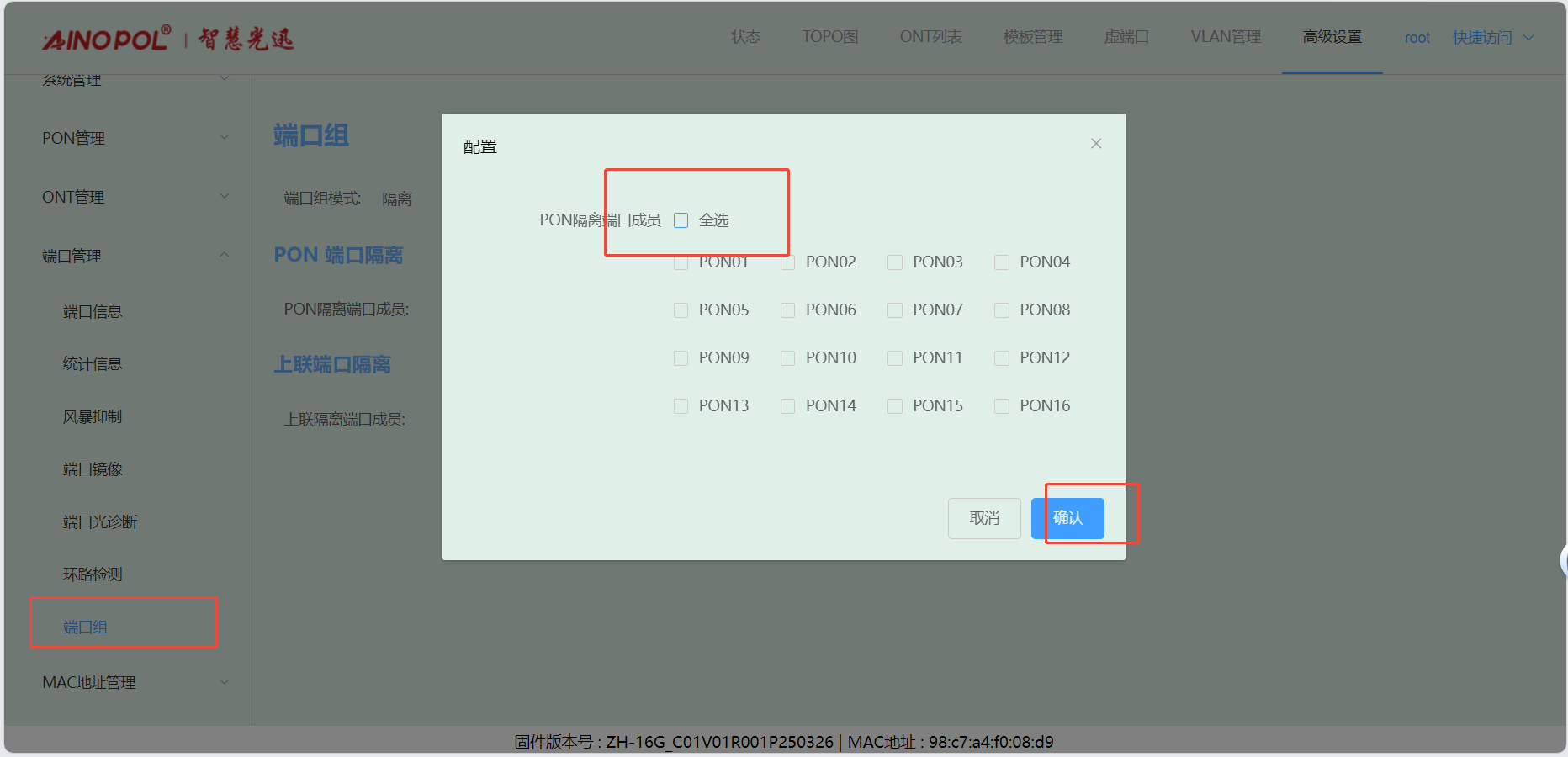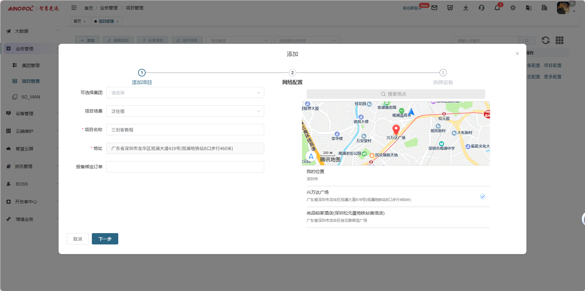 # **三剑客调试教程** 智慧光迅三剑客一般是指:融合路由、综合网关、OLT光接入设备。三剑客设备解决了项目需要的智寓、宾馆、养老院、月子中心等场景的一套解决方案。  ## 一、项目开局 ### 1、手机EAAS扫码上云 当我们的三剑客到手后先检查设备的完整性,确保该有的硬件一件不少,然后拿出我们的手机在应用商店下载EAAS云AP(即我们智慧光迅设备扫码上云以及云端维护平台),下载好后我们需要先注册自己的EAAS账号,以自己的手机号来注册,注意,创建项目的人为主账号,拥有项目的分享,移交,以及设备解绑等主要权限,被分享的人无以上权限,接下来我们根据下图步骤操作项目的创建、设备的绑定,若遇到问题则可以联系技术人员去做对应的技术处理  项目创建后可以分享给别人,让多人一起将设备扫码上云,具体步骤如下: 点进项目,下拉箭头找到分享项目,点击分享项目输入被分享人的手机号,注意被分享的人也要下载EAAS云APP并注册了账号的 ,且AP的名称以安装点位命名,需要注册电话号码的AP则以电话号码命名  手机云EAAS查看已添加设备,并远程设备进行管理  ### 2、电脑网页版EAAS上云 网页云EAAS(支持win系统)链接:[https://ztv.zhgxnet.cn/EAAS 网页云EAAS创建项目: 点击业务管理—项目管理,点击添加按钮:   网页云EAAS创建项目: 点击业务管理—项目管理,点击添加按钮:  填写项目名称(必填)、我的位置(必填)、网络配置(非必填)、选择设备(非必填); 点击完成  填写对应的设备编号,点击提交数据即可,注意AP最好以安装的点位命名,需要注册电话的话以电话号码命名(房间号命名,纯数字形式)  填写对应的设备编号,点击提交数据即可  网页云EAAS查看已添加设备,并进行管理:点击业务管理—项目管理—状态统计  设备全部上云后正常状态显示截图如下所示  ### 3、设备上架说明 (1)、将网络设备根据流量走向,从上到下进行设备安装,方便后期运维排查问题 (2)、两台设备之间至少空余1U,以保证设备的散热 (3)、布置网线时,网线长度需大于1米,短于100米。 (4)、强弱电布线时至少保持10cm以上,减少弱电网络传输时的干扰 (5)、OLT安装时一定要布置地线,以减少网络未接地造成的干扰 (6)、光纤布线时要注意不要过度弯折,尽量使用魔术贴进行理线避免光纤折损 (7)、分光时切记分光均匀,光过强(不宜高于\-10DB)、光过弱(不宜低于-25DB)、光差值过大(同一个PON下ONU接收的光值不超过10DB)都容易导致网络不稳定 ### 4、机房接线示意图  ## 二、设备调试上网 ### 1、融合路由调试上网 第一步:电脑接到融合路由的EM1(ETH1、LAN1)口,自动获取IPv 4的地址,根据获取的地址网页访问网关,进入路由的登入界面,输入默认密码Zhgxnet@123进入路由的主页,接口设置--LAN设置,设置LAN口,设置内网IP以及掩码(默认IP地址为10.8.8.1.掩码为255.255.252.0) 点击接口管理—LAN设置—LAN设置—配置  第二步:设置端口IP、掩码、DHCP地址池以及地址租期(保留10.8.8.X段做为管理设备的静态IP),注意一定要下拉高级设置将DNS改为外网提供的DNS,没有的话填223.5.5.5,114.114.114.114  第三步:WAN口的分配 点击接口管理—接口设置,根据需求进行WAN口的分配(默认1LAN/5WAN)或者在接口管理更改线路,注意更改后需要点保存才会生效  或者  第四步:设置WAN口,选择上网类型,进行外网的接入 点击接口管理—WAN设置—WAN设置,点击右侧配置按钮  第五步:根据运营商所给的外网接入类型选择对应情况并填写对应信息  ### 2、融合路由内网规划 第一步:业务网络规划 | 业务网络规划举例  第二步:针对规划的网段创建对应的LAN口  第三步:针对详细的业务规划依次创建,创建完成的详细截图如下所示:  ### 3、 OLT设备调试上网 第一步:进入设备调试界面 OLT的NMS口IP为192.168.100.1,或者直连的网口OLT默认出厂IP(VLANIF1)是:10.8.8.6/22,电脑设置同网段静态IP即可进入 第二步:OLT配置上网 点击高级设置—系统管理—接口—vlanif1—配置,即可配置OLT的IP地址 EPON  GPON  第三步:配置vlanif 1 ip地址、缺省路由IP(网关)、DNS  第四步:配置业务模板,(注意业务模板在4GS、8GS、16G一定要做,其他型号可以使用默认的全透传模板(即即插即用),且默认的是透传1-1000VLAN,超过的需要收到加一下)模板管理--线路模板--查看详情,将全透传的模板GEM1删除,保存再点击查看详情,点击增加GEM,GEM1,选择untag,点击确定,再创建一个GEM2,在GEM2增加映射VLAN,即内网需要通过的VLANID,入下图所示:     第五步,匹配虚接口,点击虚接口,点击自动匹配模板,先点击删除,删除所有,点击添加,端口选择所有,GEM1缺省VLAN1,其他不关注,点击确认,配置缺省VLAN,再点击添加,端口选择需要过对应业务的VLAN端口,填对应的信息,C-VLAN和S-VLAN填对应需要过的业务VLAN,每一条都要单独配置,      注意配置完成需要在快捷访问这里保存配置  第六步,查看ONU的注册情况,点击OUN列表可以查看全部ONU的注册详情  第七步,开启P2P,若需使得PON口下的终端设备可以互通则需要打开P2P,点击系统设置PON管理--PON设置,对应PON口的P2P打开即可  第八步,关闭隔离组,若需不通PON口下的终端设备可以互通需要将我们隔离组成员删除,点击系统设置的端口管理--端口组,点击PON端口隔离的配置,全部不选,点击确认即可   ### 4、综合网关调试上网 综合网关EM0口IP默认为10.8.8.200,可以接入EM1口设置同网段IP进行设备调试 (EM1-EM5口默认出货IP为:192.168.101.1-192.168.105.1) 