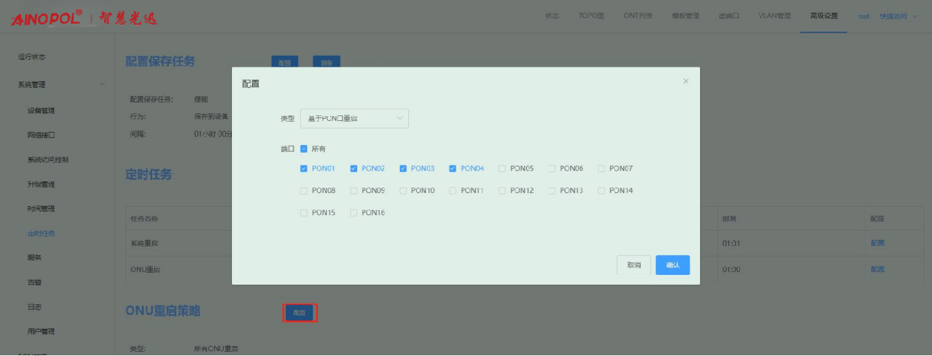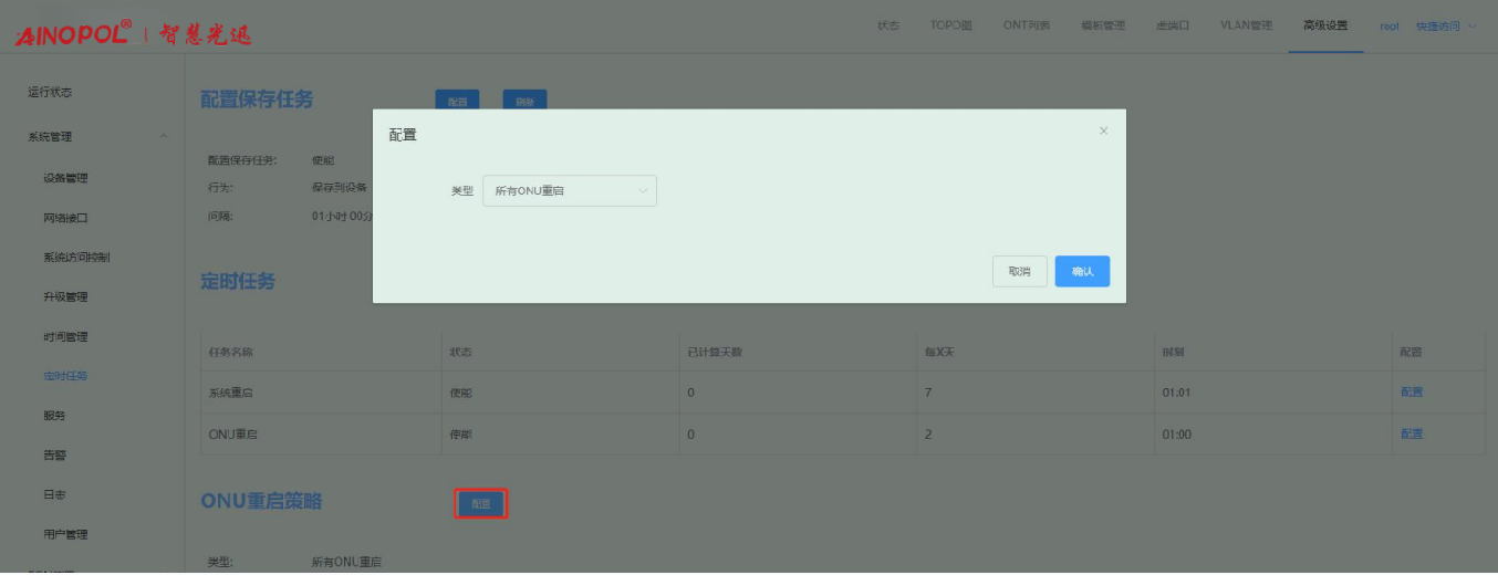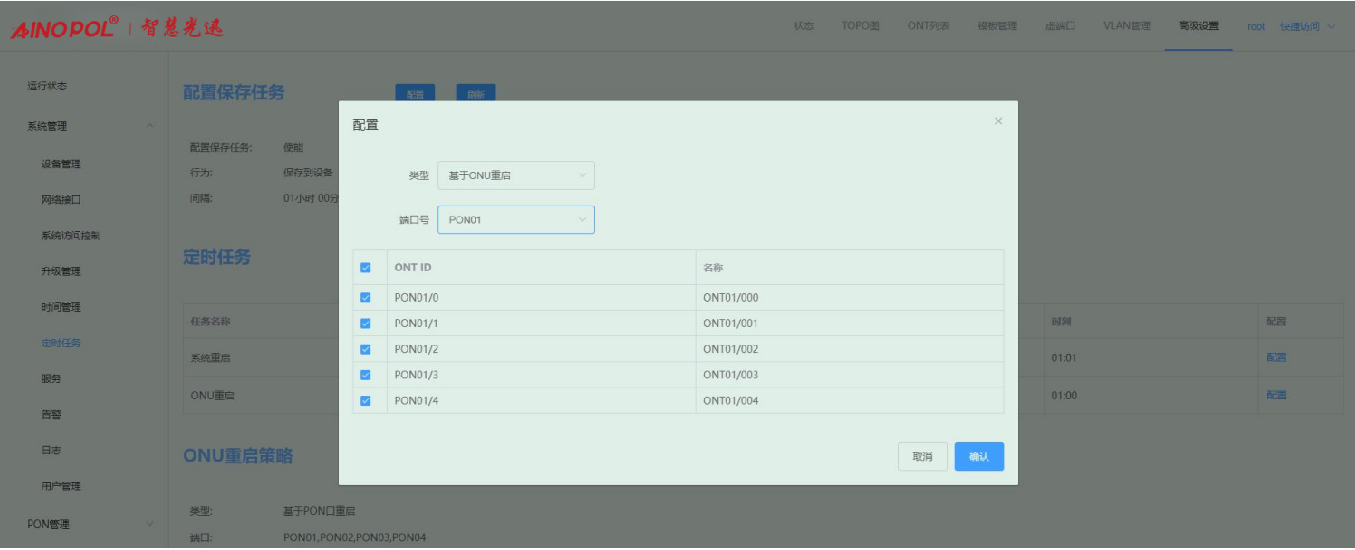 【产品教程】-基础 2026.04.09 盒式GPON ONU重启策略 点击“ONU 重启策略”右侧“配置”,可选择所有 ONU 重启、基于 PON 口重启、基于ONU重启。如下图所示 1、所有 ONU 重启  2、基于 PON 口重启  3、基于 ONU 重启