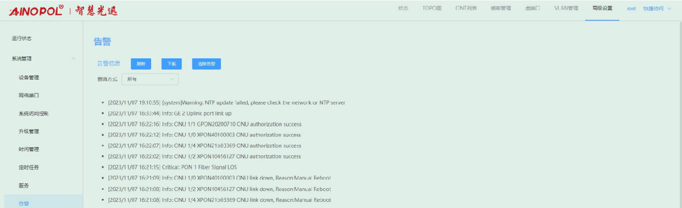 【产品教程】-基础 2026.04.09 盒式GPON 日志查询-告警列表 选择高级设置 -> 系统管理 -> 告警,可进入告警列表页面,在该界面可查看、下载和清除告警信息。如下图所示: