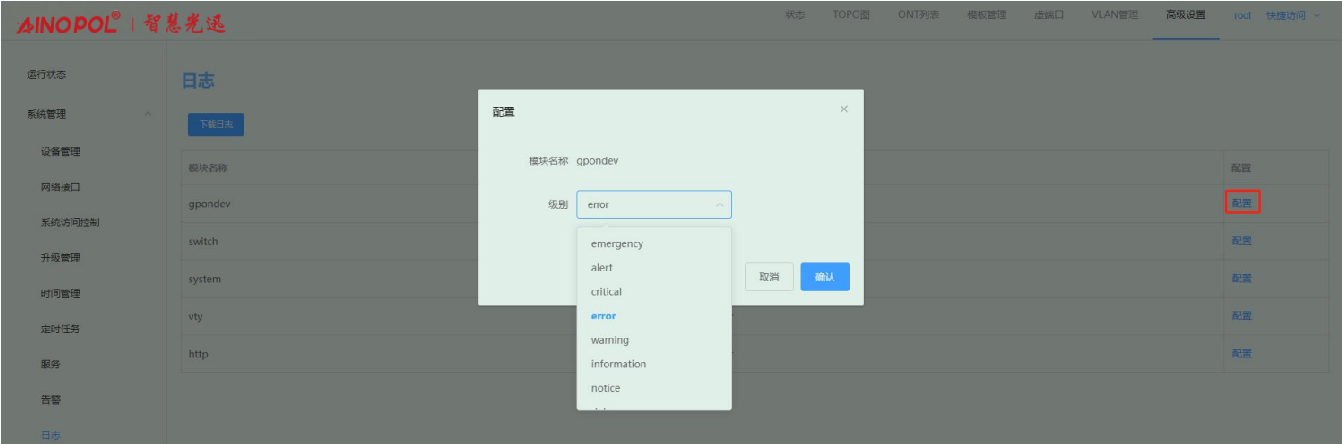 【产品教程】-基础 2026.04.09 盒式GPON 日志查询-日志等级配置和日志获取 选择高级设置 -> 系统管理 -> 日志,可进入日志页面,点击对应模块右侧“配置”,如下图所示: