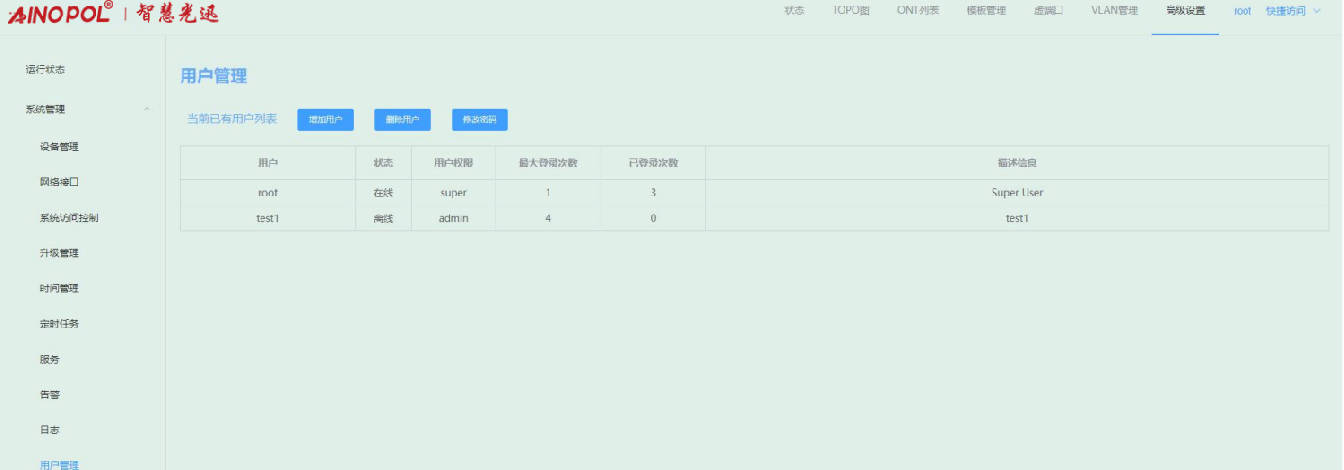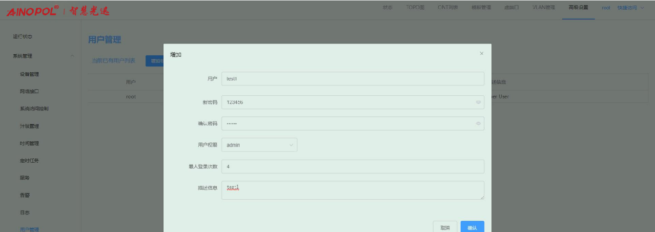 【产品教程】-基础 2026.04.09 盒式GPON 用户管理-增加用户 点击“增加用户”选项,可新增用户。如下图所示: