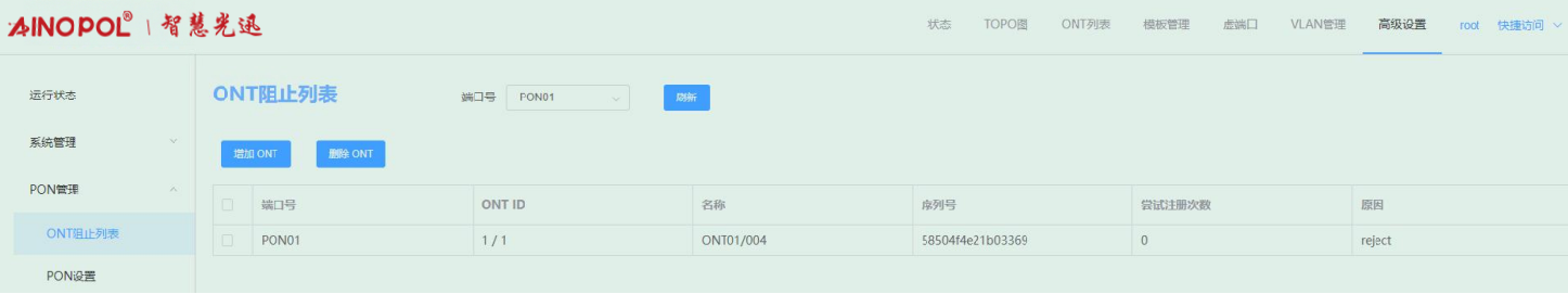 【产品教程】-基础 2026.04.09 盒式GPON ONT阻止列表-查看ONT阻止列表 选择高级设置 -> PON 管理 -> ONT 阻止列表,选择对应的 PON 端口号,可查看当前PON口下的ONT阻止列表。如下图所示: