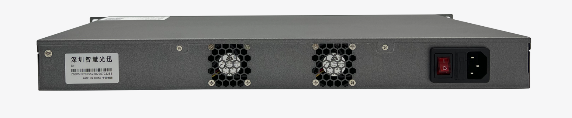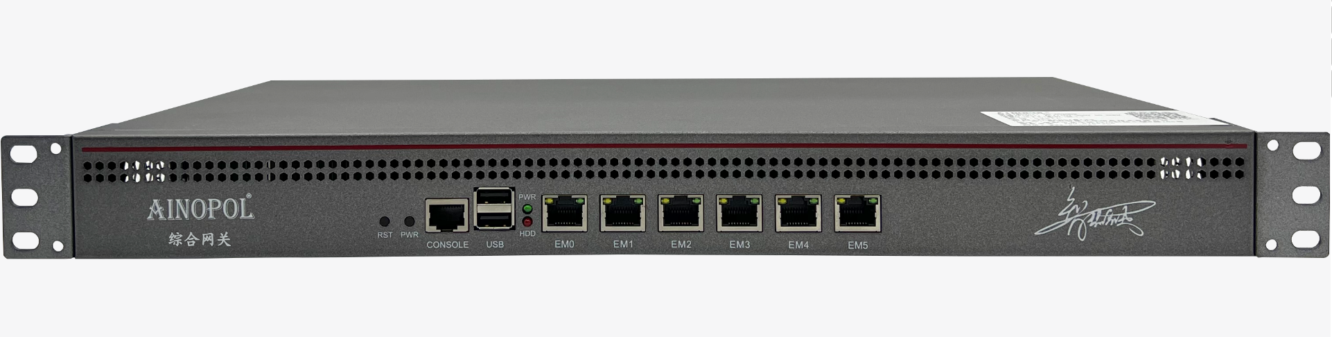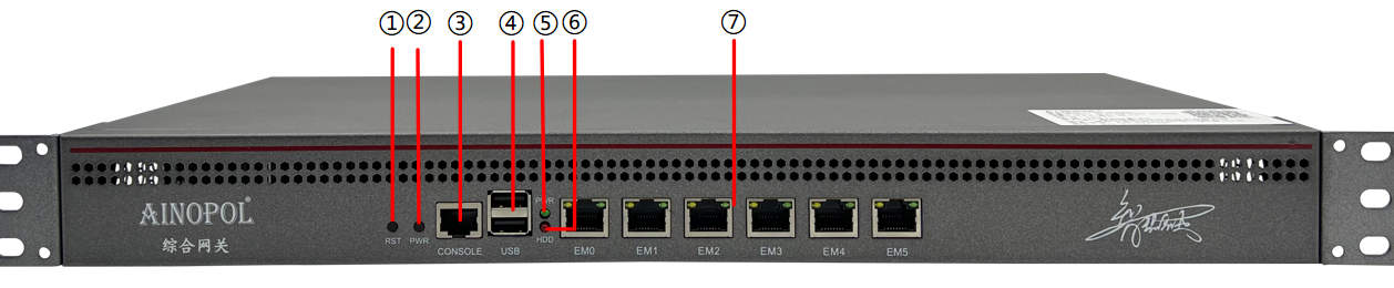多业务综合网关硬件说明 设备型号:ZH-ITV55 设备参数:多业务综合网关(质保3年) 6\*10/100/1000/2500M电口 2\*USB2.0接口 1\*CONSOLE接口 19寸1U机架式 功耗<30瓦 内置电源 100-240V AC50/60Hz 产品尺寸:430x300x45mm 产品重量:3.25kg 工作温度:-10℃~65℃ 产品外观及硬件规格说明:  图1 ZH-ITV55产品正面  图2 ZH-ITV55产品背面 1、接口说明  ①:RST键:复位键 ②:PWR键:电源键 ③:CONSOLE接口:是一种典型的配置接口,用于服务器后台命令行管理。通过使用Console线直接连接至计算机的串口。 ④:USB3.0接口:可接入U盘、键盘、鼠标等设备。常用于服务器初始化、重新写入使用。 ⑤:PWR指示灯(蓝):设备电源指示灯,系统启动时闪烁,正常运行时定住。 ⑥:HDD指示灯(红):设备硬盘指示灯,闪烁则代表在读写数据。 ⑦:EM0-EM5接口:RJ45网口,用于服务器音视频流量的输入与输出。  ⑧:风扇:用于服务器散热 ⑨:电源接口:需接入AC 220V 电源。