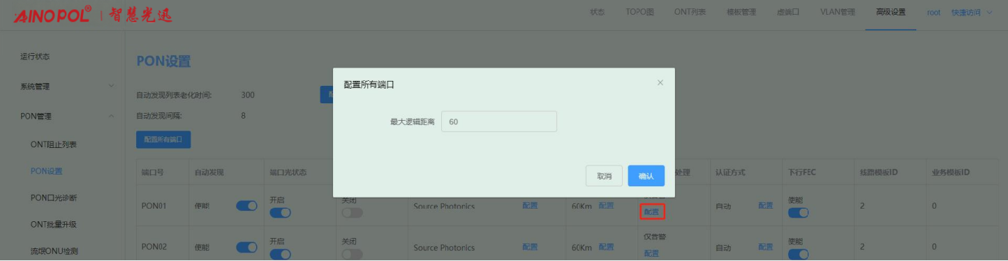 【产品教程】-基础 2026.04.09 盒式GPON PON设置-最大逻辑距离 点击 PON 口“最大逻辑距离”的“配置”按钮,可以修改最大逻辑距离,此数值取决于模块,系统默认60km。如下图所示: