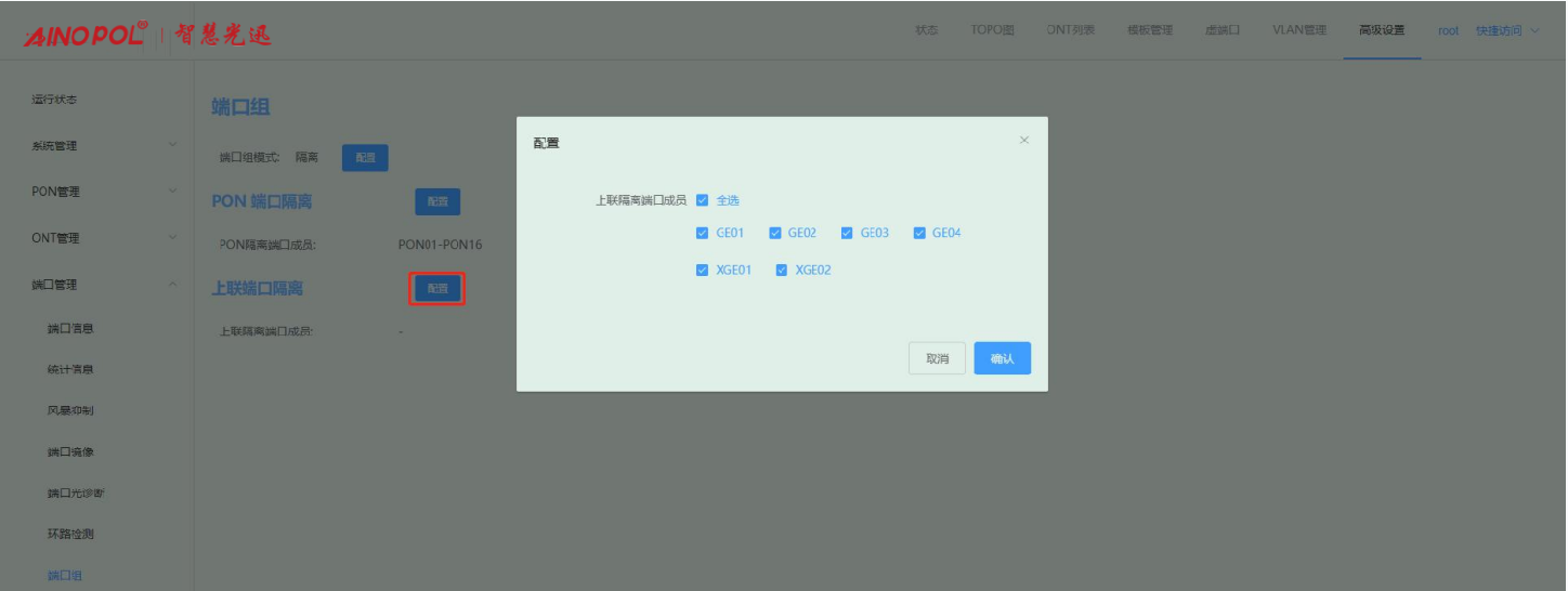 【产品教程】-基础 2026.04.09 盒式GPON 端口管理-端口组隔离模式 隔离模式下,端口之间不能相互通信。可通过点击“配置”按钮去配置端口隔离,默认PON端口隔离打开,上联口端口隔离关闭。如下图所示: