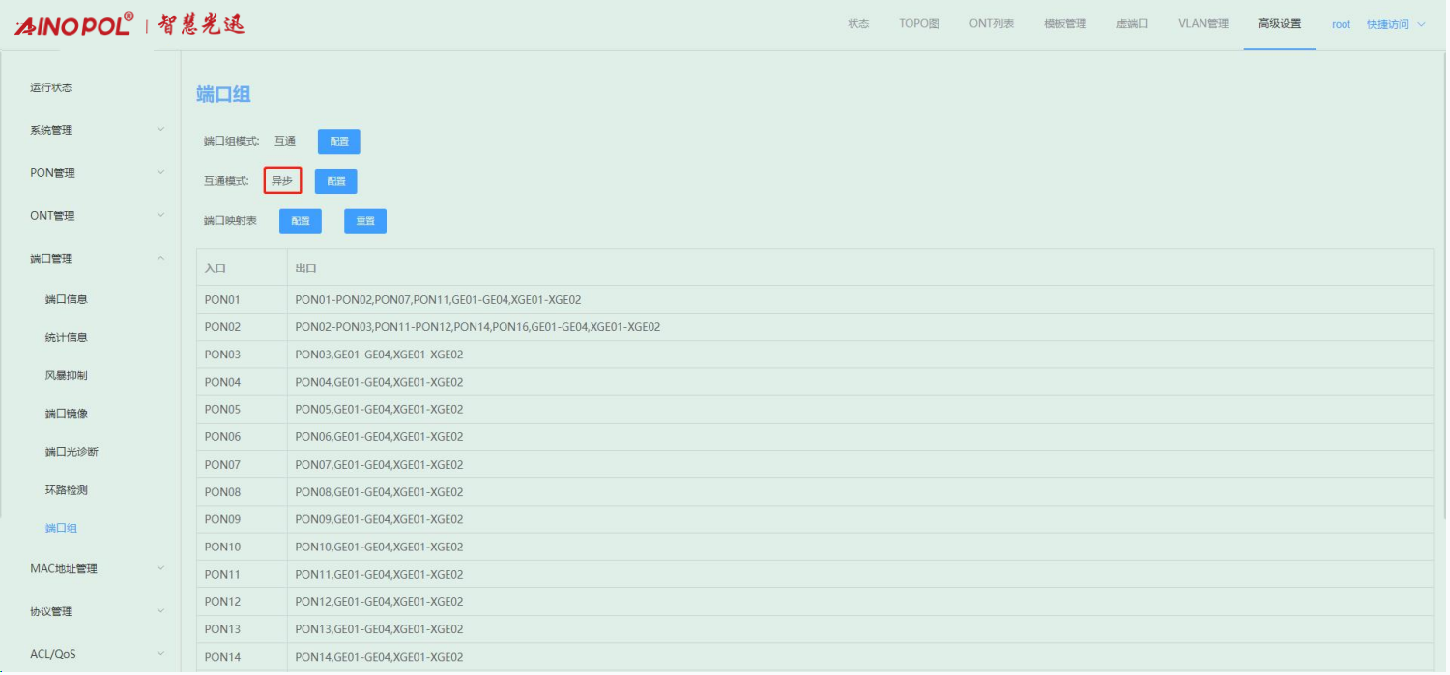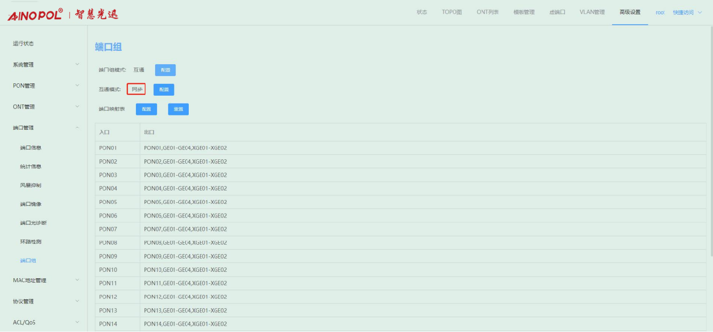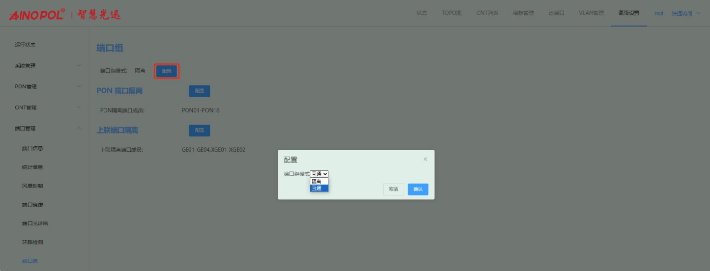 【产品教程】-基础 2026.04.09 盒式GPON 端口管理- 进入端口组页面,点击“配置”按钮,选择互通模式,进入到互通模式设置页面,配置互通组,先选择入端口,再选择对应的出端口,配置后的端口组只能在端口成员内互相通信,跟组外端口隔离。具体如下图所示:    当互通模式为“同步”时,若改变入端口 A 的出端口配置,则 A 端口的出端口作为入端口时,对应的出端口也会发生同步改变,端口之间的出入口配置是同步发生改变的。若要端口之间出入口配置不同步发生改变,则要配置互通模式为“异步”。