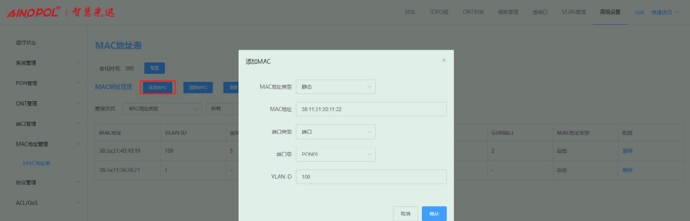 【产品教程】-基础 2026.04.09 盒式GPON MAC地址表-静态 MAC 地址添加 点击“添加 MAC”按钮,选择 MAC 地址类型为静态 MAC。如下图所示: