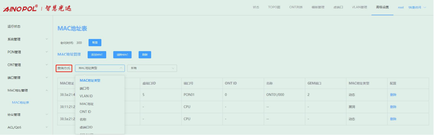 【产品教程】-基础 2026.04.09 盒式GPON MAC地址表-查看 MAC 地址 可以根据 MAC 地址类型、端口号、VLAN ID、MAC 地址、ONT ID 等查询相应的MAC地址。如下图所示: