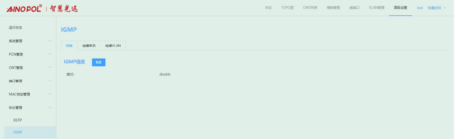 【产品教程】-基础 2026.04.09 盒式GPON 协议管理-IGMP协议开启 选择高级设置 -> 协议管理 -> IGMP,点击“配置”可查看和设置 IGMP 参数,系统中该功能默认为disable 模式。如下图所示: