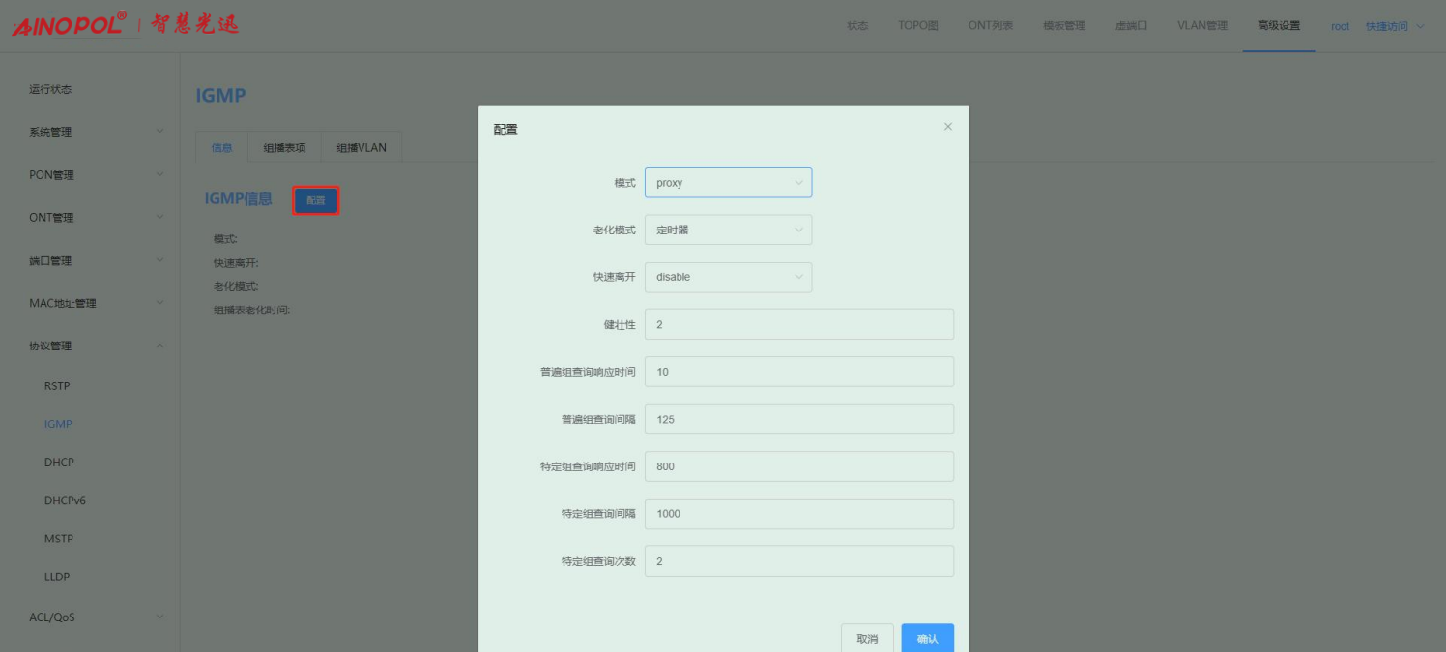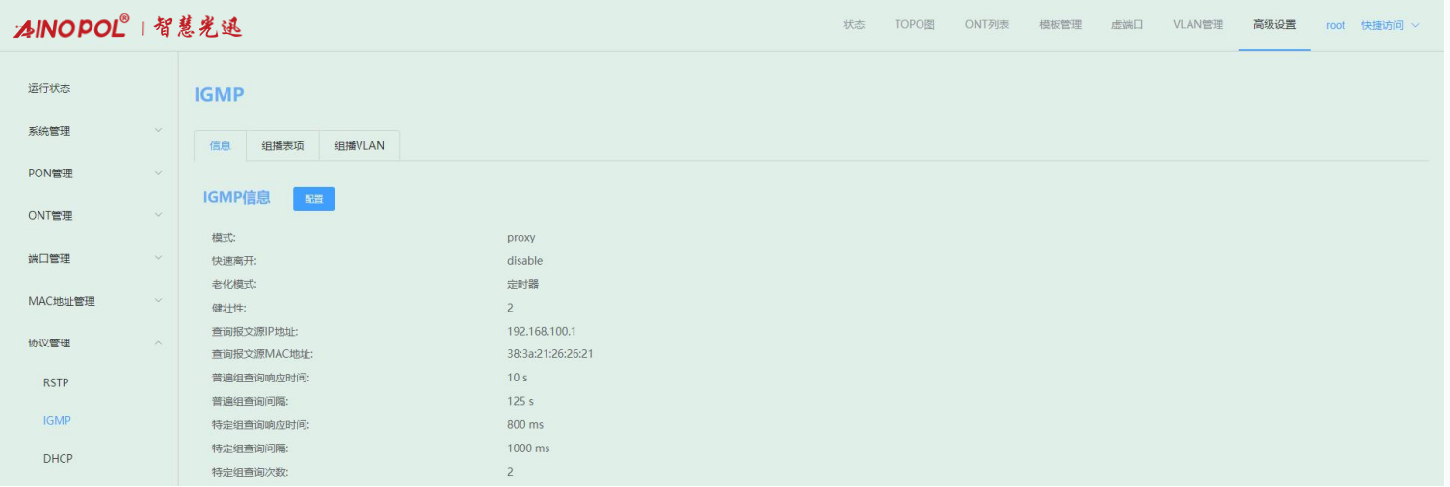 【产品教程】-基础 2026.04.09 盒式GPON 协议管理-IGMP Proxy 模式 进入 IGMP 管理页面,点击“配置”选项,配置 IGMP 模式为 Proxy,以及老化模式、快速离开、健壮性系数、普遍组查询最大响应时间、普遍组查询间隔、特定组查询响应时间、特定组查询间隔和系数等参数。如下图所示:   老化模式:同上 快速离开:同上 健壮性系数:根据网络的稳定性情况变化,用户希望调整健壮性系数时,可使用此命令。设置后,系统使用该健壮性系数以确认组播用户的老化时间。健壮性系数为增强系统的健壮性而设置的系数,它直接影响组播用户的老化时间长短,也影响发送通用组查询报文的次数。如果一个子网可能会丢包,应该增加健壮性系数,以保证组播用户的稳定性。缺省为 2。 查询报文源IP 地址:配置组播路由器向用户侧发送的通用组查询报文或者特定组查询报文的源IP地址,缺省为 192.168.100.1。 查询报文源 MAC 地址:配置组播路由器向用户侧发送的通用组查询报文或者特定组查询报文的源MAC 地址,缺省为设备带内地址。 普遍组查询响应时间:通用组查询报文发出后,在响应时间内所有在线用户都会回应report 报文,缺省下为 10 秒。 普遍组查询间隔:当设备处于 proxy 模式,设备会在每个通用组查询间隔时间发送一个通用组查询报文。缺省为 125 秒。 特定组查询响应时间:特定组查询报文发出后,在响应时间内所有在线用户都会回应report 报文,缺省下为 800 毫秒。 特定组查询间隔:针对某一特定的节目按照此命令设置的间隔发送特定组查询来确认用户是否正在收看该节目,没有收到用户反馈的 report 报文,就认为用户没有在收看这个节目,系统不再发送该节目流给用户,避免用户没有收看节目却仍然收到组播流而浪费了带宽。缺省为1000 毫秒。 特定组查询次数:针对某一特定的节目通过发送 N 次(N 通过此命令设置)特定组查询来确认用户是否正在收看该节目,缺省为 2 次。
