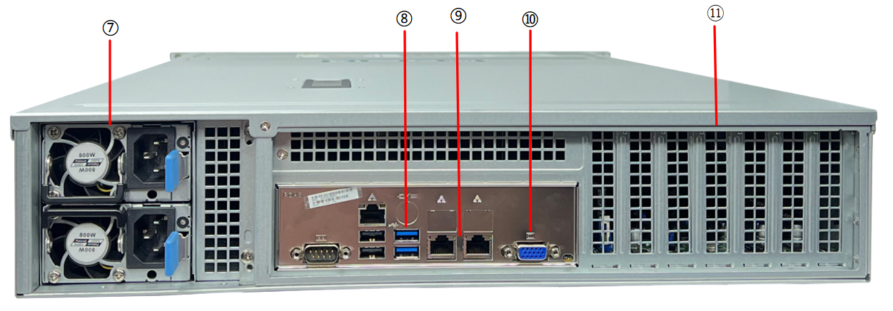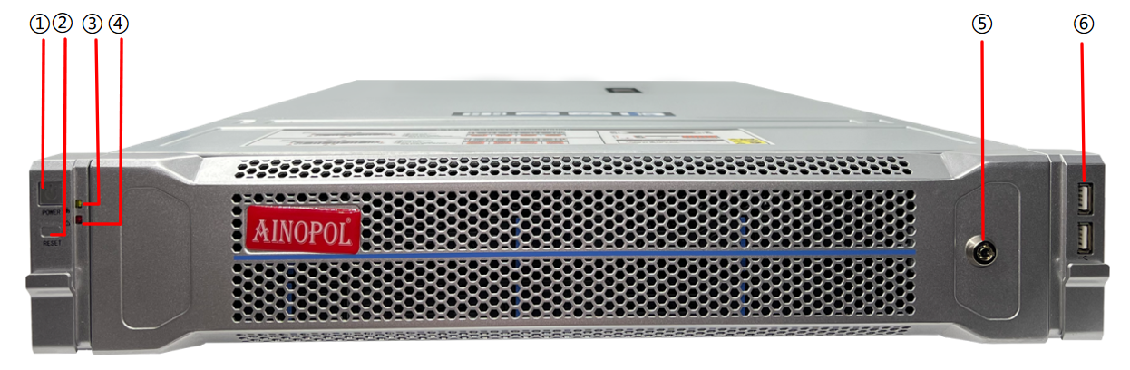 多业务综合网关硬件说明 设备型号:ZH-HA1 设备参数:6\*10/100/1000M电口 2\*10GE光口 2\*USB端口2.0 2\*USB端口3.0 1\*VGA接口 19寸2U机架式 功耗<150瓦 电源\*2(100-240V AC50/60Hz) 产品尺寸:675x440x90mm 产品重量:15.65kg 工作温度:-10℃~65℃ 产品外观:  图1 ZH-HA1产品正面  图2 ZH-HA1产品背面 接口说明:  ①:POWER:设备电源键,开启后设备才能正常运行。 ②:RESET:恢复出厂设置按键,需长按。 ③:PWR指示灯(蓝):设备电源指示灯,系统启动时闪烁,正常运行时定住。 ④:HDD指示灯(红):设备硬盘指示灯,闪烁则代表在读写数据。 ⑤:硬盘槽位锁:内有硬盘插槽可拓展硬盘 ⑥:USB2.0接口:可接入U盘、键盘、鼠标等设备。常用于服务器初始化、重新写入使用。  ⑦:电源口(双电源):需接入 100-240V AC 50/60Hz ⑧:USB2.0接口:可接入U盘、键盘、鼠标等设备。常用于服务器初始化、重新写入使用。 ⑨:网络接口:RJ45网口,用于服务器音视频流量的输入与输出。 ⑩:VGA接口:VGA接口可外接显示器。 ⑪:网卡拓展插槽:可拓展千兆网口网卡、SFP+万兆光口网卡,用于服务器音视频流量的输入与输出。