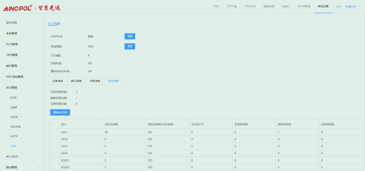 【产品教程】-基础 2026.04.09 盒式GPON 协议管理-LLDP协议统计信息 点击“统计信息”,可查看发现/删除/过期邻居总数,也可批量删除端口统计信息。如下图所示: