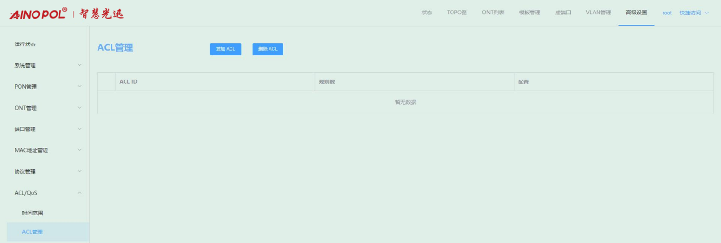【产品教程】-基础 2026.04.09 盒式GPON ACL访问控制-ACL 管理 当需要通过匹配规则对特定的数据报文进行过滤时,使用此配置创建 ACL(访问控制列表)。选择高级设置 -> ACL/QoS -> ACL 管理,可以配置 ACL 规则。如下图所示:
