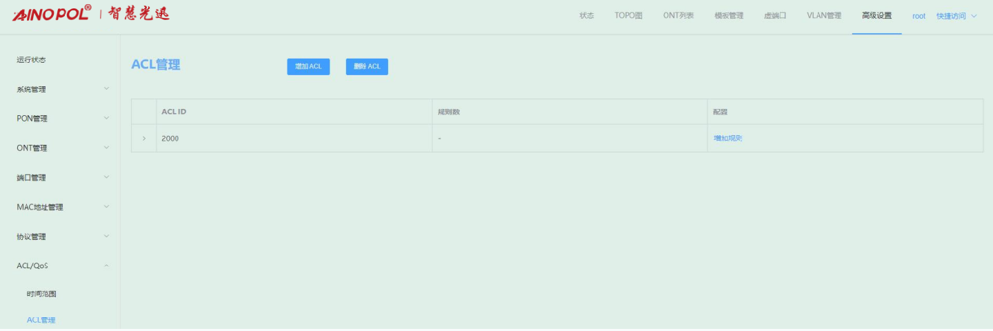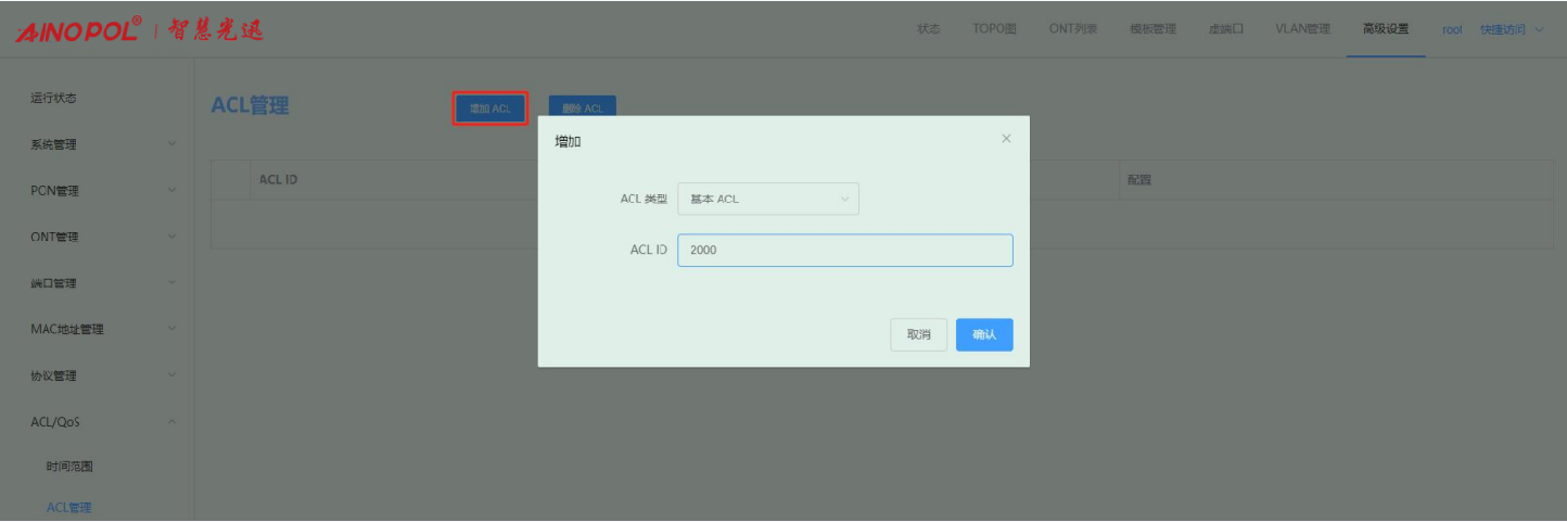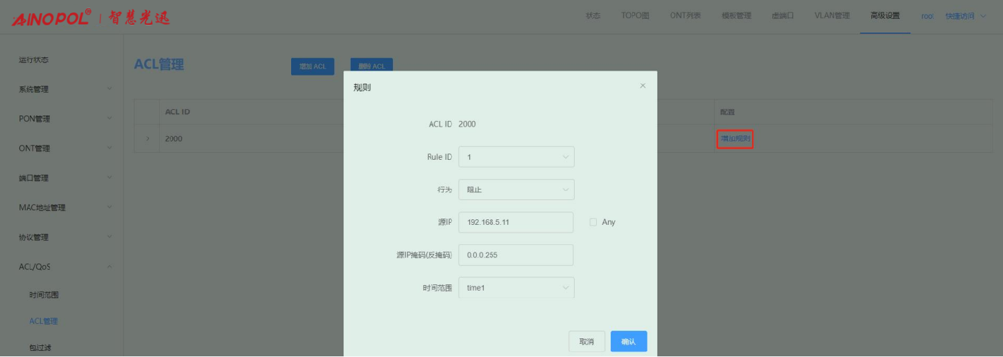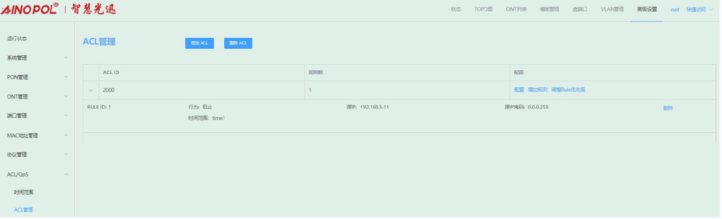 【产品教程】-基础 2026.04.09 盒式GPON ACL访问控制-ACL 管理(基本ACL) 当需要根据报文的源 IP 地址制定 ACL 规则时,可配置基本 ACL 来实现。成功创建规则后,可以使用packet-filter 命令引用规则对报文进行过滤。 1、创建基本 ACL,ID 取值范围为 2000-2999。点击“增加 ACL”,选择“基本ACL”,如下图所示  添加好后,情况如下图所示:  2、增加规则,最大可创建 16 条,ID 越大优先级越高,可以选择时间范围,在指定的时间内生效或者不使用时间范围立即生效。点击 ACL ID 右侧“增加规则”去配置规则,如下图所示:  点击 ACL ID 左侧箭头可展开查看规则详情,点击“配置”可以修改规则,点击上方“删除ACL”或ACLID条目中“删除”可删除该条目,也可在页面增加规则和调整 Rule 优先级。如下图所示: