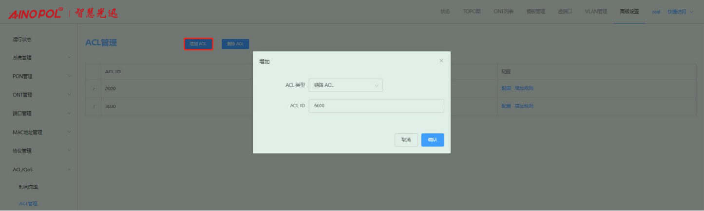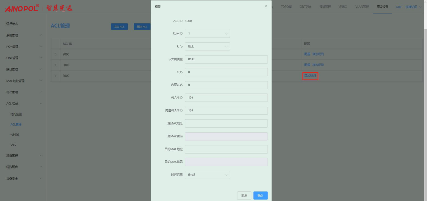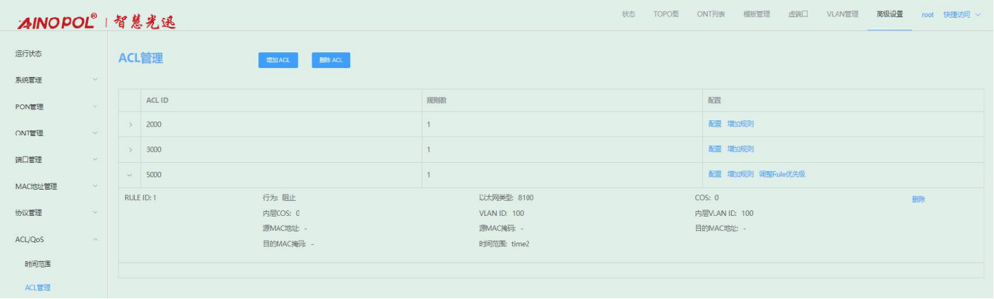 【产品教程】-基础 2026.04.09 盒式GPON ACL访问控制-ACL 管理(链路ACL) 当需要根据报文的源 MAC 地址、源 VLAN ID、二层协议类型、目的 MAC 地址等链路层信息制定ACL规则时,可配置链路 ACL 来实现。成功创建规则后,可以使用包过滤命令引用规则对报文进行过滤。 1、 创建链路 ACL,ID 取值范围为 5000-5999。点击“增加 ACL”,选择“链路ACL”,如下图所示:  2、 增加规则,最大可创建 16 条,ID 越大优先级越高,可以选择时间范围在指定的时间内生效或者不使用时间范围立即生效。点击 ACL ID 右侧“增加规则”去配置规则,如下图所示:  点击 ACL ID 左侧箭头可展开查看规则详情,点击“配置”可以修改规则,点击上方“删除ACL”或ACLID条目中“删除”可删除该条目,也可在页面增加规则和调整 Rule 优先级。如下图所示: