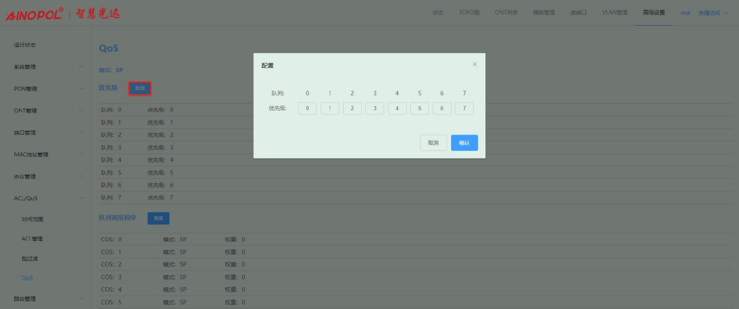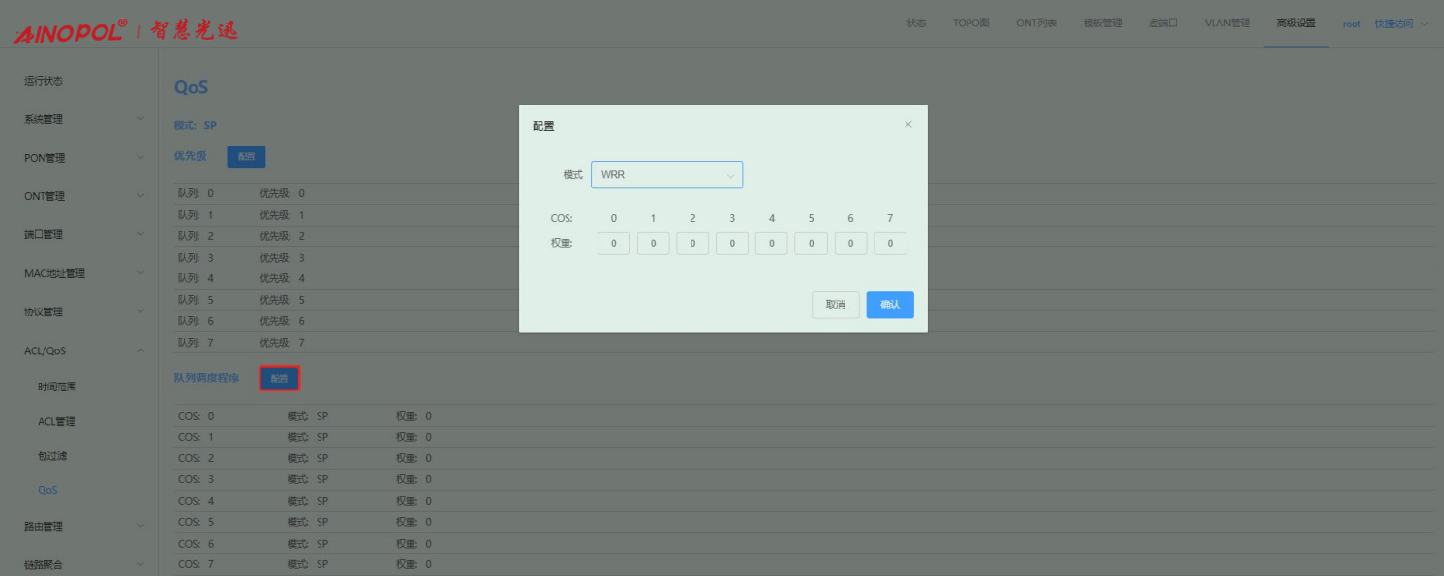 【产品教程】-基础 2026.04.09 盒式GPON QOS流量控制 用于配置系统的队列调度模式,设备支持 8 个队列。队列调度,就是将需要从同一个端口发送出去的报文划分到多个队列中,在队列与队列之间进行调度,以决定哪个队列的报文先发送,哪个队列的报文后发送。当用户需要根据业务的重要程度选择不同的队列调度模式,以确保在网络出现拥塞时仍能为重要业务提供 QoS 保证时,使用此配置。 选择高级设置 -> ACL/QoS -> QoS,可以配置 QoS 等参数。 1、 设置优先级和队列的映射关系。如下图所示:  2、 设置队列调度,默认是严格优先级调度(SP),如果选择 WRR 模式,所有权重相加必须等于100或 0。如下图所示: