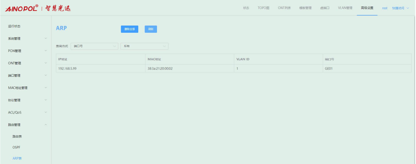 【产品教程】-基础 2026.04.09 盒式GPON 路由管理-ARP表 选择高级设置 -> 路由管理 -> ARP 表,可查看和删除 ARP 表项。如下图所示: