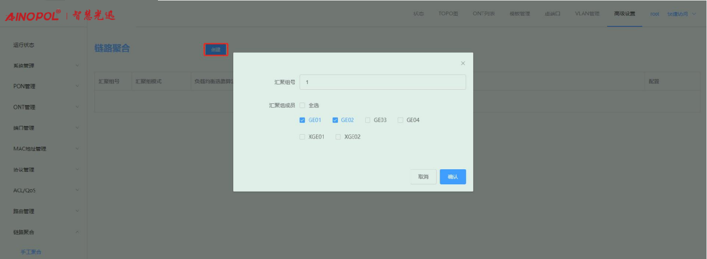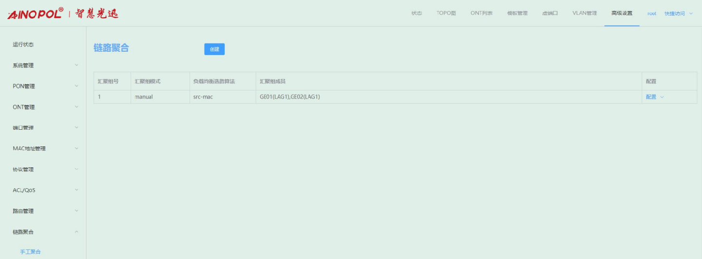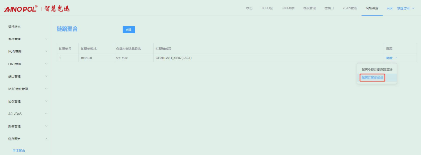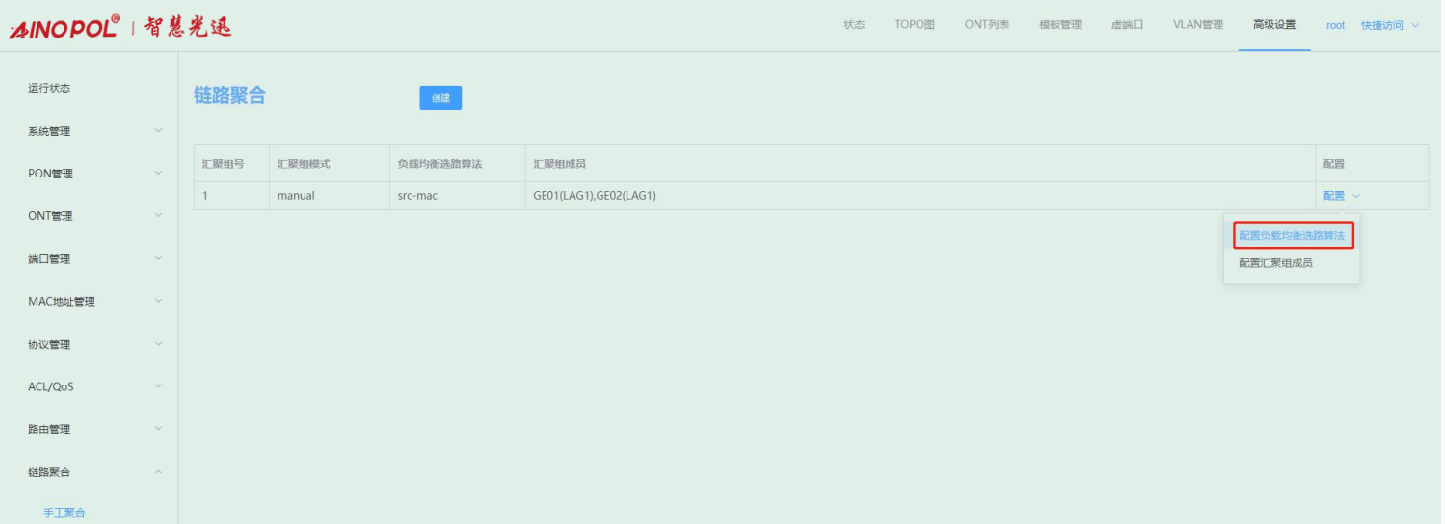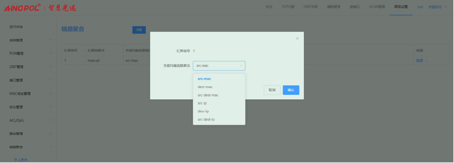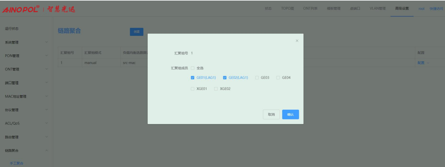 【产品教程】-基础 2026.04.09 盒式GPON 链路聚合-手动聚合 链路聚合是多个同类型的上联端口捆绑为一个逻辑端口,在不升级硬件的情况下,达到增大上联端口带宽的目的,并且通过链路备份机制,有效提升链路之间的可靠性。 选择高级设置 -> 链路聚合 -> 手工聚合后,可对端口进行手工聚合。 1、 创建汇聚组 点击“创建”,输入组 ID 和选择端口成员。如下图所示  注意: 一个端口不能同时加入多个汇聚组; 生成树协议:加入汇聚组的端口会当成一个逻辑端口进行协议运算; 上联口环路检测:当端口加入汇聚组,该端口环路检测不生效; 上联端口属性:加入汇聚组的成员端口属性必须一致:速率、端口类型、MTU、端口限速、风暴控制;配置汇聚组成员端口属性时,组内成员绑定在一起配置; VLAN 属性:加入汇聚组的成员端口 VLAN 配置必须一致:PVID、端口VLAN;配置汇聚组成员VLAN时,组内成员绑定在一起配置; 端口镜像目的端口不能作为聚合组成员加入聚合组,同时加入聚合组的端口不能成为镜像目的端口; 配置了静态 MAC 地址的端口不能作为聚合组成员加入聚合组; 配置了 ACL 规则的端口不能作为聚合组成员加入聚合组; 配置了组播 VLAN 路由端口不能作为聚合组成员加入聚合组。 2、 查看汇聚组 创建成功后,可以查看到加入汇聚组的成员端口,并且可以在该汇聚组内增加和删除汇聚组成员。 如下图所示:  3、 配置负载均衡选路算法 负载均衡选路算法默认是基于 src-mac 进行哈希计算,鼠标移至汇聚组右侧“配置”,点击“配置负载均衡选路算法”,可配根据需求配置其他选路算法。如下图所示:   4、 配置汇聚组成员 点击右侧“配置汇聚组成员”,勾选/去勾选端口可增加或删除汇聚组中的成员端口。如下图所示: