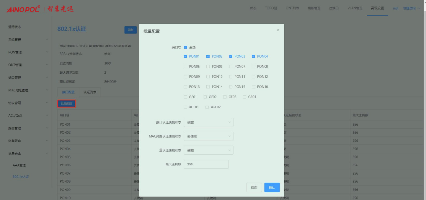 【产品教程】-基础 2026.04.09 盒式GPON 设备安全-802.1x 认证端口配置 点击“批量配置”可以批量配置端口认证使能状态、MAC 旁路认证使能状态、重认证使能状态和最大主机数。若使能 MAC 旁路认证,则没有 802.1x 认证客户端的设备可通过 MAC 地址进行认证。若使能重认证,则认证到期后自动下发报文进行终端重认证。使能端口认证如下图所示