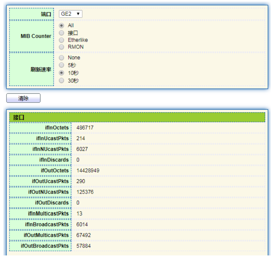 【产品教程】2026.04.15 盒式交换机(千兆)系统配置-端口统计 介绍端口的详细流量统计信息,以及用户需要手动刷新或清除的信息。 操作步骤: 1.单击导航树中的“系统状态 > 端口信息 > 端口统计”菜单,进入端口统计界面,如下图所示:  说明:“清除”当前端口的流量统计信息并刷新页面。