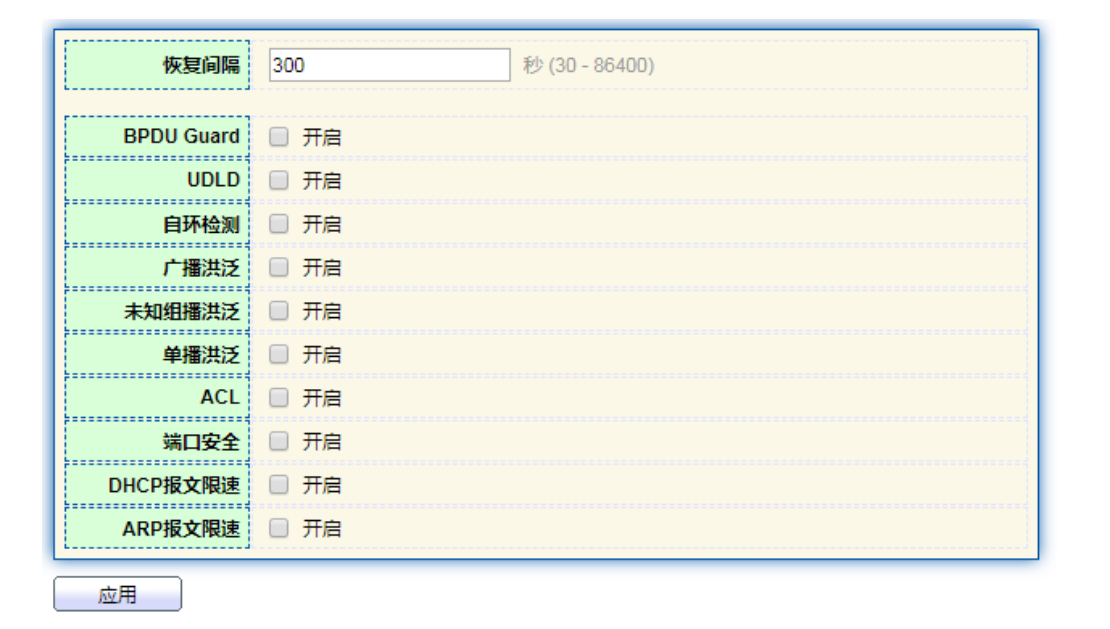 【产品教程】2026.04.15 盒式交换机(千兆)端口设置-端口异常保护 一般来说,如果交换机的软件检测到端口有错误,端口会立即关闭。换言之,当交换机的操作系统在交换机端口上检测到一些错误事件时,交换机将自动关闭端口。 操作步骤: 1、 单击导航树中的“端口 > 端口异常保护”菜单进入界面,如下图所示:
