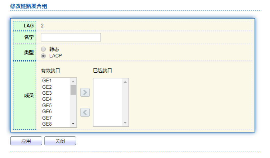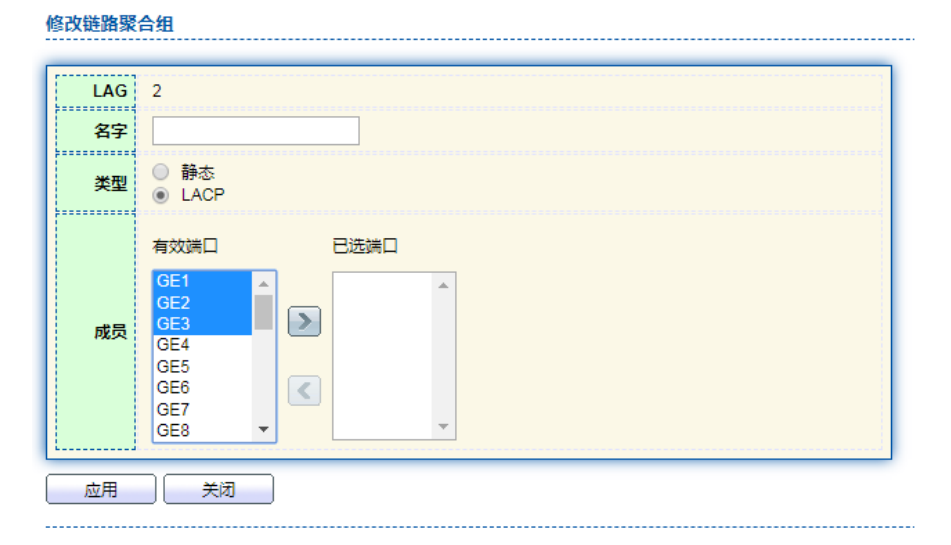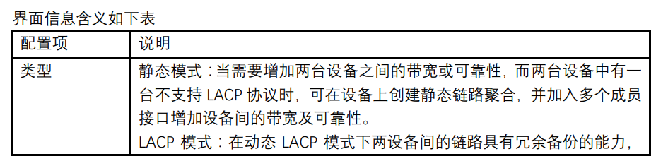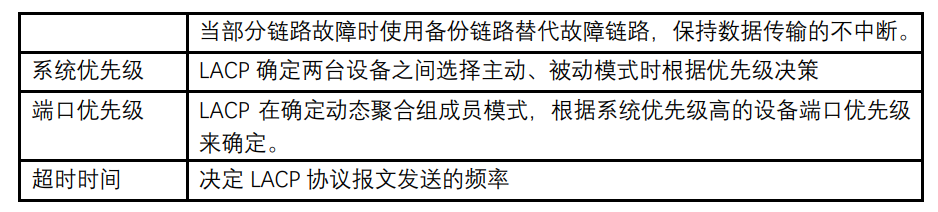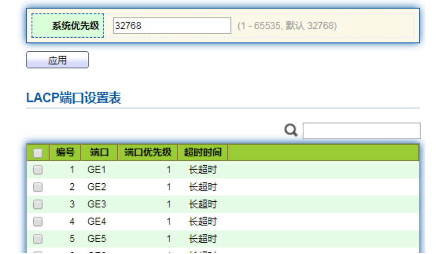 【产品教程】2026.04.15 盒式交换机(千兆)端口设置-LACP 配置 基于 IEEE802.3ad 标准的 LACP(Link Aggregation Control Protocol,链路汇聚控制协议)是一种实现链路动态汇聚与解汇聚的协议。LACP 协议通过 LACPDU(Link AggregationControl Protocol Data Unit,链路汇聚控制协议数据单元)与对端交互信息。 开启某端口的LACP 协议后,该端口将通过发送LACPDU向对端通告自己的系统优先级、系统 MAC、端口优先级、端口号和操作 Key。对端接收到这些信息后,将这些信息与其它端口所保存的信息比较以选择能够汇聚的端口,从而双方可以对端口加入或退出某个动态聚合组达成一致。 动态 LACP 聚合是一种系统自动创建或删除的汇聚,动态汇聚组内端口的添加和删除是协议自动完成的。只有速率和双工属性相同、连接到同一个设备、有相同基本配置的端口才能被动态汇聚在一起。 添加动态链路聚合操作步骤: 1、单击导航栏中“端口 > 链路聚合 > 聚合组配置”菜单,进入链路聚合组配置界面,选择要配置的链路汇聚组 ID,点击修改按钮进入修改页面,选择类型为 LACP,如下图所示:  2、单击导航栏中“端口 > 链路聚合 > LACP 配置”菜单,进入 LACP 属性配置页面,可以配置 LACP 相关属性,如系统优先级,端口优先级,端口超时方式等,如下图:    说明: 改变 Eth-Trunk 工作模式前请首先确保该 Eth-Trunk 中没有加入任何成员接口,否则无法修改 Eth-Trunk 的工作模式。本端和对端配置的工作模式应保持一致。 举例说明: 以太网交换机 Switch A 使用 3 个端口(GE1~GE3)汇聚 接入以太网交换机 Switch B,实现流量在各成员端口中的负载分担。 下面的实际配置中,将采用动态汇聚方式分别进行举例  说明: 以下只列出对 Switch A 的配置,对 Switch B 也需要作相同的配置,才能实现端口汇聚。 操作步骤: 1、单击导航栏中“端口 > 链路聚合 > 聚合组配置”菜单,进入链路聚合组配置界面,选择 LAG 2,单击“修改”,选择 GE1-GE3,选择类型为 LACP,点击“应用”即可,如下图: