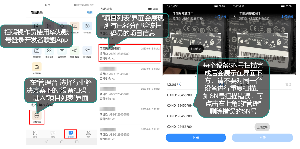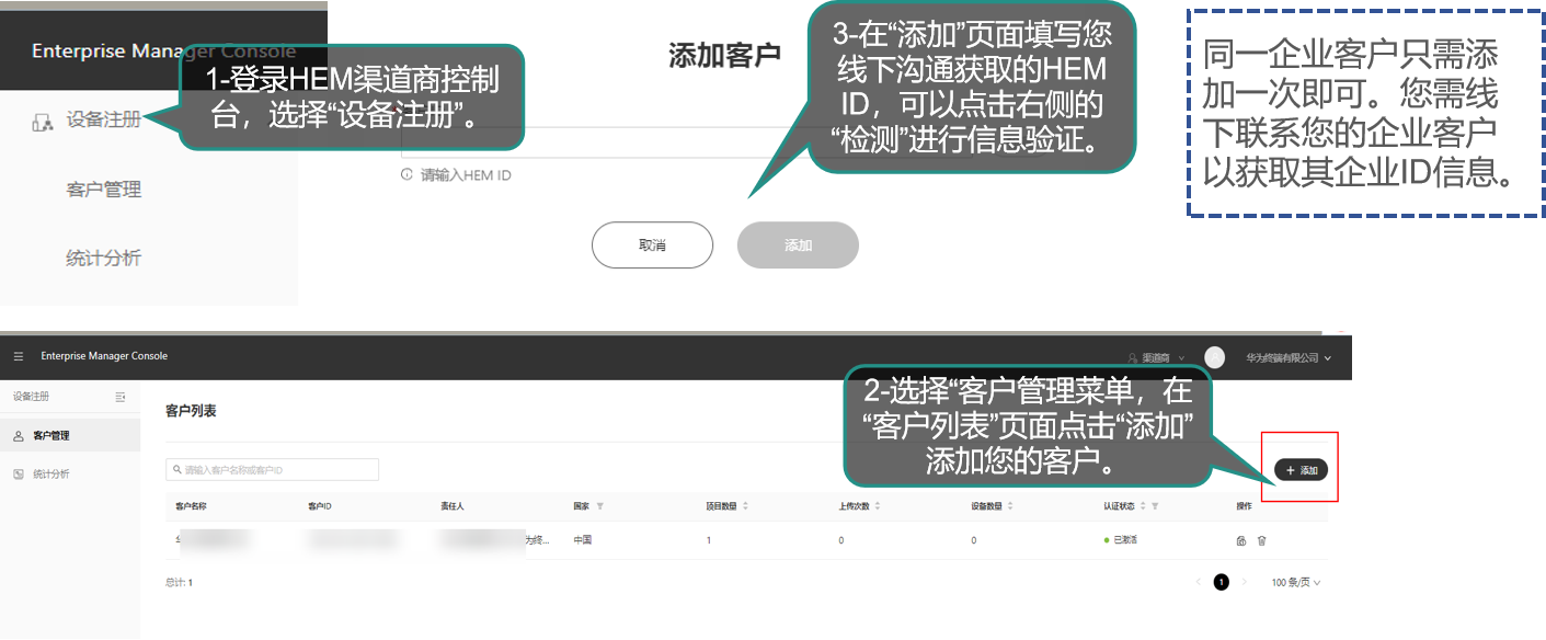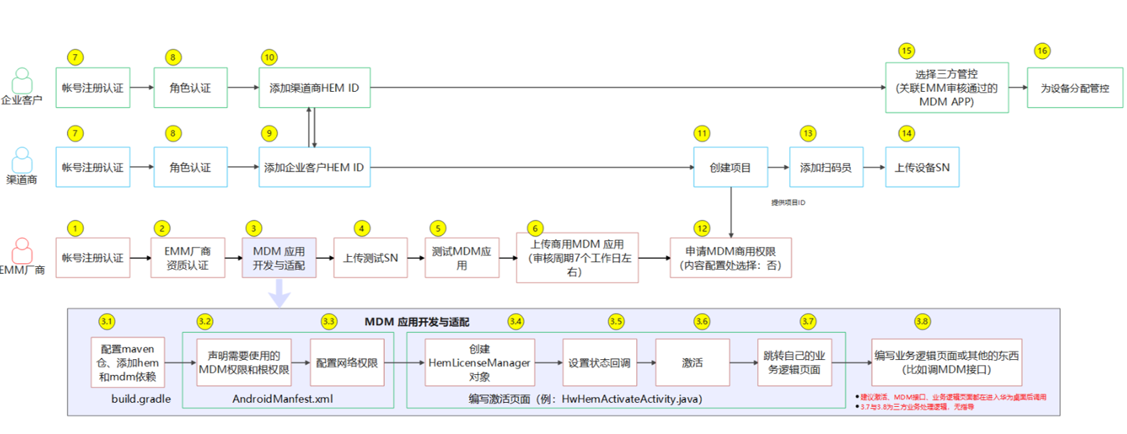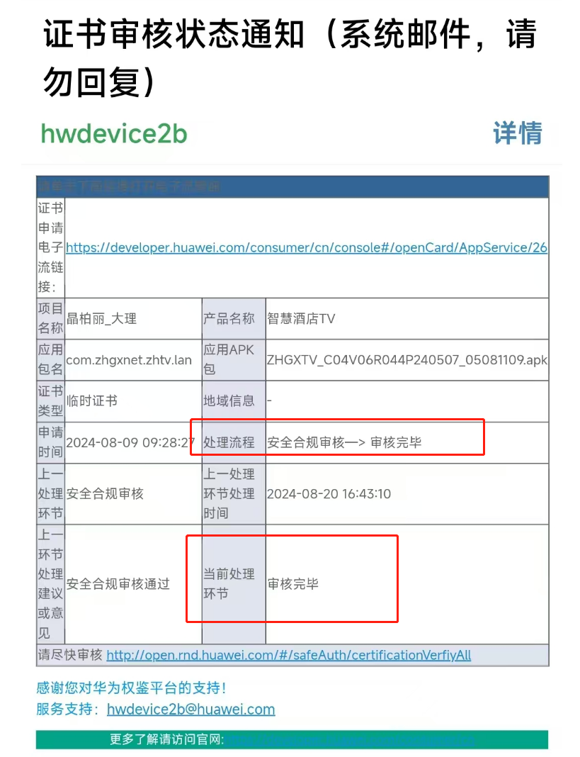 ## 华为电视刷机 **一、华为智慧屏离线版本证书的申请和apk安装落地(开机自启)** 您好,华为智慧屏幕的对接流程如下: (1)针对项目登记证书申请(这里需要写单位名称,邮箱,项目规模(电视机台数)) (2)现场提供8台可以测试的电视机mac地址,吴工这边提交申请测试证书 (3)测试证书申请下来后,邮箱这边回收到通知,这时候联系咱们,吴工这边根据测试证书打包一个测试APK (4)找一台之前统计了mac的电视吗,安装测试APK,功能测试效果OK后,吴老师这边提交正式证书的申请 (5)待2-3周时间,正式证书申请下来,邮箱会收到信息,联系咱们,吴工这边打包正式证书的APK (6)安装正式证书的APK 在授权证书申请提交后,咱们可以留意关注邮箱中华为授权证书的审核状态,可以联系通过业务线,及时联系催促授权证书的审核状态。 在申请华为授权证书的前,需要采集一下您这边的基本信息,如下: > \*项目名称: > \*项目规模: > \*企业联系邮箱: > \*企业联系电话: > \*应用包名:com.zhgxnet.zhtv.lan > 项目所在省市: > \*8台电视的mac(测试证书包出来后,咱们需要找到这8台电视进行试安装): > 以上基本信您可以编辑好后发送下给咱们。  收到这个的话咱们就可以进行下面的安装流程了 **二、华为智慧屏HEM版本证书的申请和apk安装落地(开机自启)** 在HEM的整体落地流程中,咱们是EMM厂商的角色,由于咱们已经使用过这个方案落地过,因此,在后面的新项目中,步骤1-6 已经不需要再重复进行(在之前的项目中已经申请适配并通过了的),只需要从第7步开始即可  华为HEM服务平台的使用指导 访问地址:https://developer.huawei.com/business/cn/doc/HEM/hem_user-guide_certification_rhjsrz-0000001547976112  步骤7:账号注册和认证 注册账号,有两种注册方式  步骤7:账号注册和认证 注册后的账号登录  步骤8:角色认证 注册好账号后,要实名认证,实名认证后再进行角色认证  步骤8:角色认证 注册好账号后,要实名认证,实名认证后再进行角色认证  步骤9:渠道商添加企业客户 在绑定企业用户之前,您需要获取他的HEM ID信息  步骤9:渠道商添加企业客户 在绑定企业用户之前,您需要获取他的HEM ID信息  步骤11:新建部署项目   步骤13:为项目添加扫码操作员   步骤14:扫码员扫码添加设备  步骤14: 检查扫码的设备上传情况  安装操作流程: 1、U盘放华为专版的APK(吴老师这边出的,带有正式证书的APK) 2、电视开机,开机进入到主页之后,U盘插电视,这个时候会提示是否U盘接入,咱们选择是   然后这里选择咱们的APK  等待校验过程,校验完成后正常选择安装  安装好后点击完成  第二步骤:设置页激活APK   F     第三步,重启电视,再次进入到咱们的APK后会弹出权限允许提示,咱们选择允许  第四步,允许之后,咱们就可以重启电视了