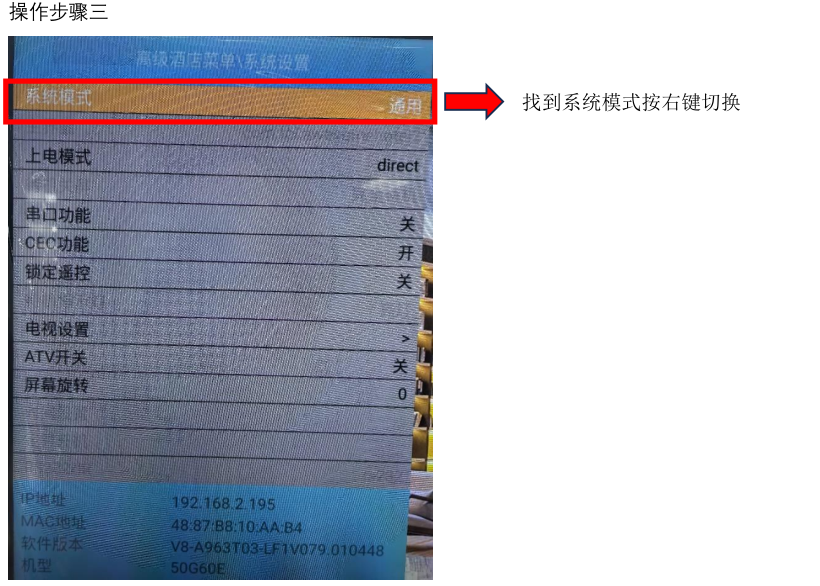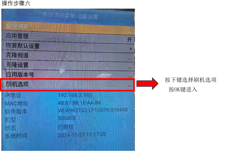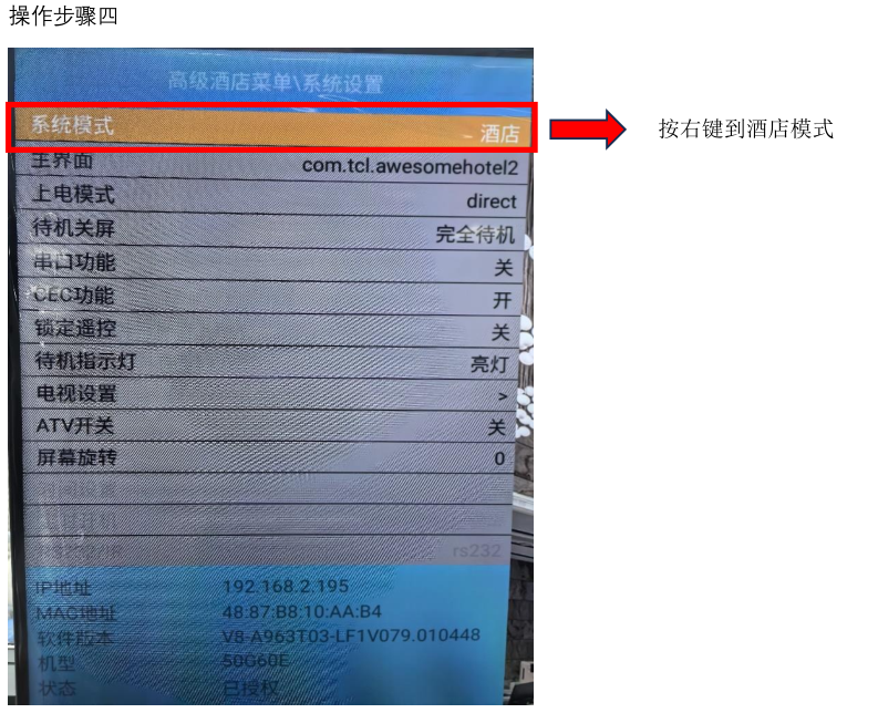 ### **TCL电视机刷机** ==前提:TCL大部分工程机均可找我们做刷机包== #### U盘刷机 U盘格式要求FAT32,刷机包ZIP文件直接放U盘根目录,U盘不放其他文件 升级方法:请按遥控器蓝色键+绿色键+1950,系统设置,系统模式,按右改成酒店模式,再接U盘,电视会提示确定或取消,点取消后,然后提示OTA升级按确认,再按Update就可以进行升级了。 #### TCL在线刷机 一、具体操作方法: 第一步:遥控器依次按:蓝绿1950 进入TCL设置页  第二步,当前模式修改为酒店模式     第三步:进入刷机选项,填写验证码刷机  验证码咱们填写:82879002  通过文件名命名规则来判断需要下载哪个包! 文件:V8-A963T02-LF1V999-C06G62E.zip V8-A963T02-LF1V999 刷机包名称;C06 本地综合网关终端; G62E电视机设备型号; 文件:V8-A963T02-LF1V999-C05G62E.zip V8-A963T02-LF1V999 刷机包名称;C05 云屏终端; G62E电视机设备型号;