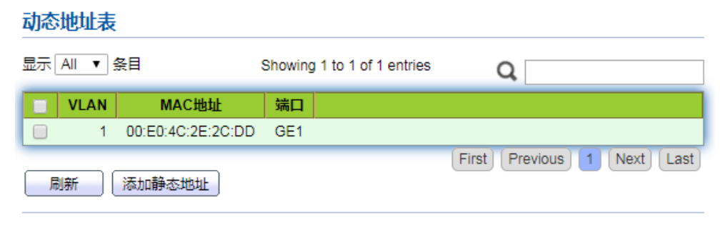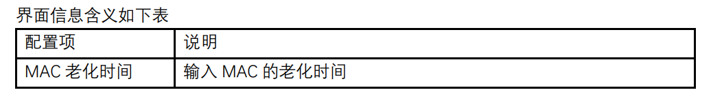 【产品教程】2026.04.15 盒式交换机(千兆) MAC 地址表-动态 MAC 地址表 在该页,可以设置 MAC 地址老化时间以及查看 MAC 地址表信息,为适应网络的变化,MAC 地址表需要不断更新。MAC 地址表中自动生成的表项并非永远有效,每一条表项都有一个生存周期,到达生存周期仍得不到刷新的表项将被删除,这个生存周期被称作老化时间。如果在到达生存周期前记录被刷新,则该表项的老化时间重新计算。设置合适的老化时间可以有效实现 MAC 地址的老化功能。用户设置的老化时间过短,可能导致交换机广播大量找不到目的 MAC 地址的数据报文,影响交换机的运行性能。如果用户设置的老化时间太长,交换机可能会保存许多过时的 MAC 地址表项,从而耗尽 MAC 地址转发表资源,导致交换机无法根据网络的变化更新 MAC 地址转发表。如果用户设置的老化时间太短,交换机可能会删除有效的 MAC 地址表项,降低转发效率。一般情况下,推荐使用老化时间的缺省值300 秒。 设置 MAC 地址老化时间操作步骤: 1\. 单击导航树中的“MAC 地址表 > 动态 MAC 地址表”菜单,进入动态 MAC 地址表配置和显示界面:    说明: MAC 表用于存放交换机所学习到的其它设备的 MAC 地址、VLAN 编号和出接口信息等。在转发数据时,根据以太网帧中的目的 MAC 地址和 VLAN 编号查询 MAC 表,快速定位设备的出接口。 要检查系统 MAC 地址表,请参阅第 3 章第 3.3 节。