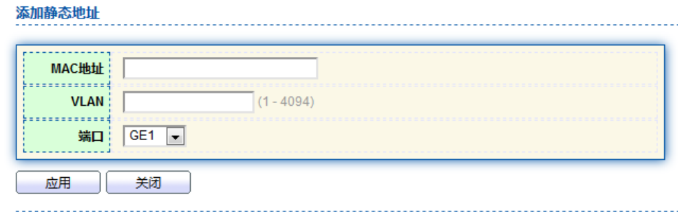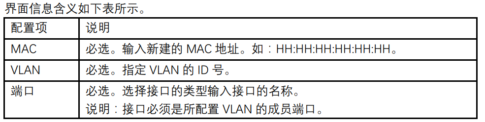 【产品教程】2026.04.15 盒式交换机(千兆) MAC 地址表-静态 MAC 地址表 静态表项由用户手工配置,并下发到各接口板,表项不老化。新建静态 MAC 地址步骤: 1、 单击导航树中的“MAC 地址表 > 静态 MAC 地址表”菜单,进入静态 MAC 地址表界面,如下图所示。    2、 填写相应的配置项。单击“应用”,完成配置。