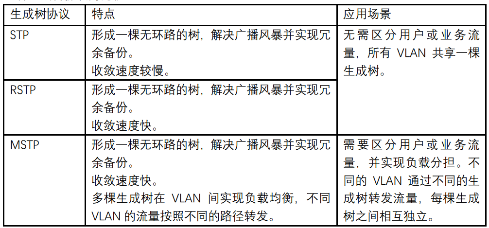 【产品教程】2026.04.15 盒式交换机(千兆) 生成树协议-基本概念 以太网交换网络中为了进行链路备份,提高网络可靠性,通常会使用冗余链路。但是使用冗余链路会在交换网络上产生环路,引发广播风暴以及 MAC 地址表不稳定等故障现象,从而导致用户通信质量较差,甚至通信中断。为解决交换网络中的环路问题,提出了生成树协议 STP(Spanning Tree Protocol)。 与众多协议的发展过程一样,生成树协议也是随着网络的发展而不断更新的,从最初的IEEE 802.1D 中定义的 STP 到 IEEE 802.1W 中定义的快速生成树协议 RSTP(Rapid SpanningTree Protocol),再到最新的 IEEE 802.1S 中定义的多生成树协议 MSTP(Multiple SpanningTree Protocol)。 生成树协议中,MSTP 兼容 RSTP、STP,RSTP 兼容 STP。 三种生成树协议的比较如表所示。三种生成树协议的比较  在以太网交换网中部署生成树协议后,如果网络中出现环路,生成树协议通过拓扑计算,可实现: ⚫ 消除环路:通过阻塞冗余链路消除网络中可能存在的网络通信环路。 ⚫ 链路备份:当前活动的路径发生故障时,激活冗余备份链路,恢复网络连通性。