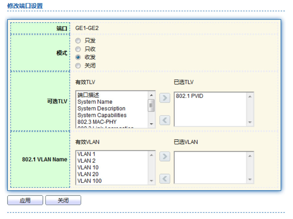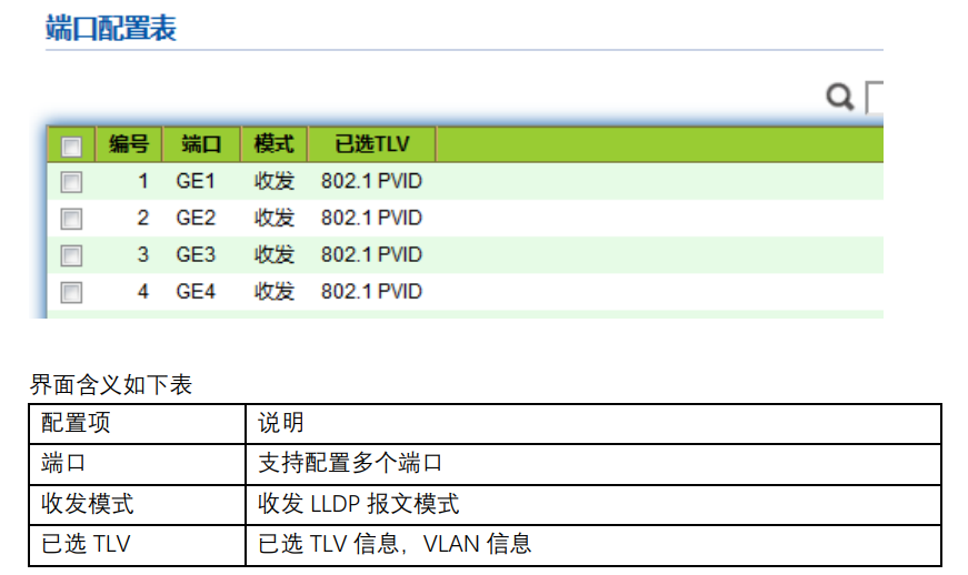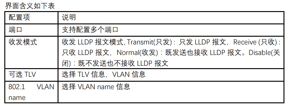 【产品教程】2026.04.15 盒式交换机(千兆) 拓扑发现-LLDP端口配置 操作步骤 1、 单击导航树中的“拓扑发现> LLDP > 端口配置”菜单,进入“端口配置”界面,如下图所示。  说明: LLDP 有以下四种工作模式。Transmit(只发) : 只发 LLDP 报文, Receive (只收) : 只收LLDP 报文,Normal(收发):既发送也接收 LLDP 报文。Disable(关闭):既不发送也不接收 LLDP报文。 2、选择相应端口点击“修改”进入修改端口设置页。单击“应用”完成配置,如下图所示。
