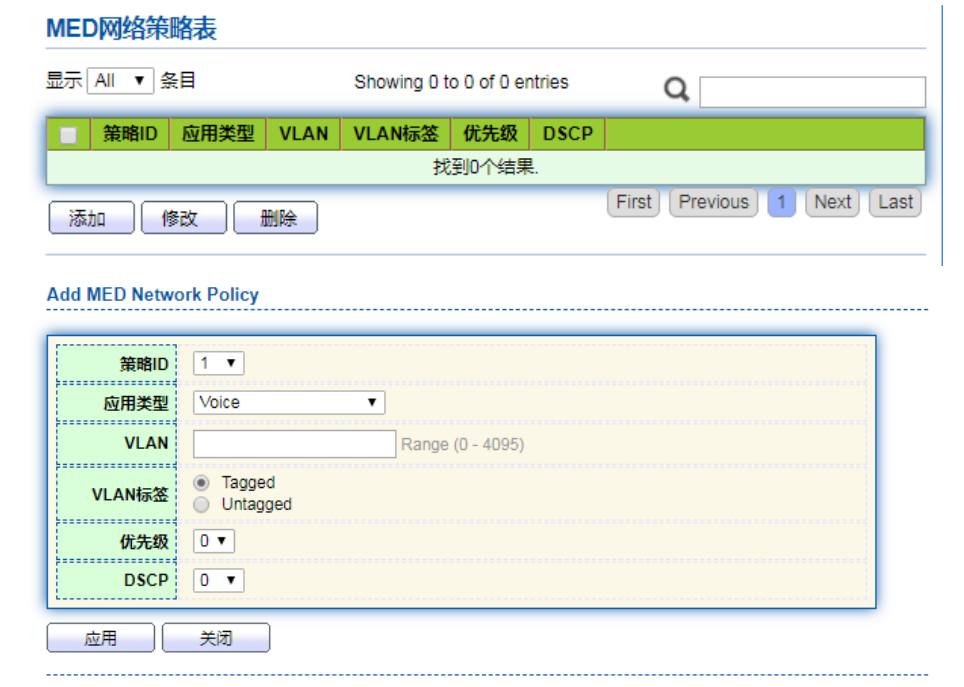 【产品教程】2026.04.15 盒式交换机(千兆) 拓扑发现-MED 网络策略配置 MED 是基于 IEEE802.1ab 的邻居发现协议,LLDP 是 IEEE 的邻居发现协议,可以被其他组织扩展。从网络设备(如交换机和无线接入点)识别的信息可以帮助进行故障分析,并允许管理系统准确地了解网络拓扑结构。 操作步骤: 1、单击导航树中的“拓扑发现 > LLDP > MED 网络策略配置”菜单进入界面,如下图所示: