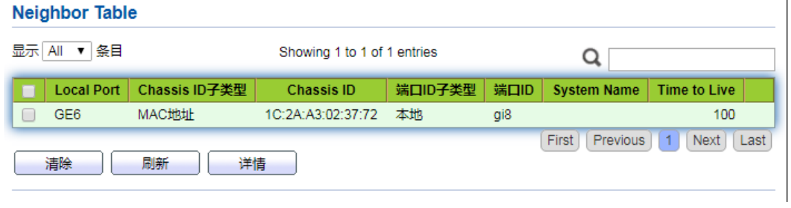 【产品教程】2026.04.15 盒式交换机(千兆) 拓扑发现-邻居信息 LLDP 邻居显示操作步骤1. 单击导航树中的“拓扑发现> LLDP > 邻居信息”菜单,进入“LLDP 邻居”界面,如下图所示。