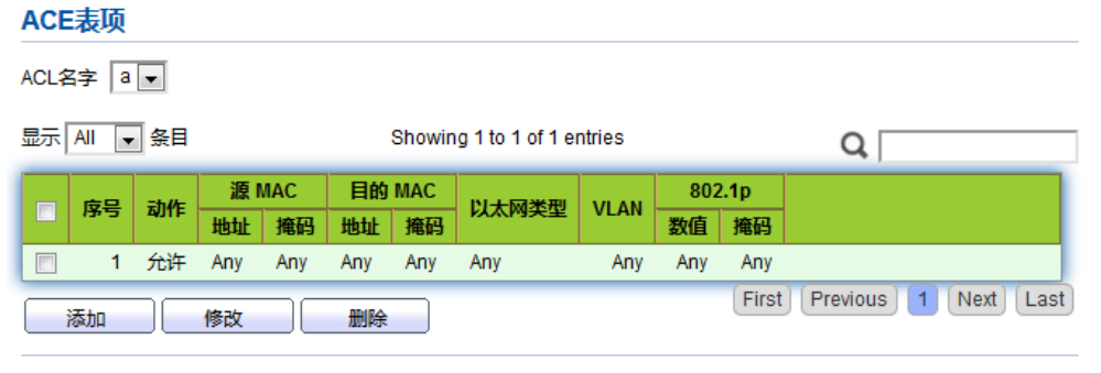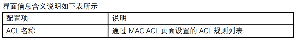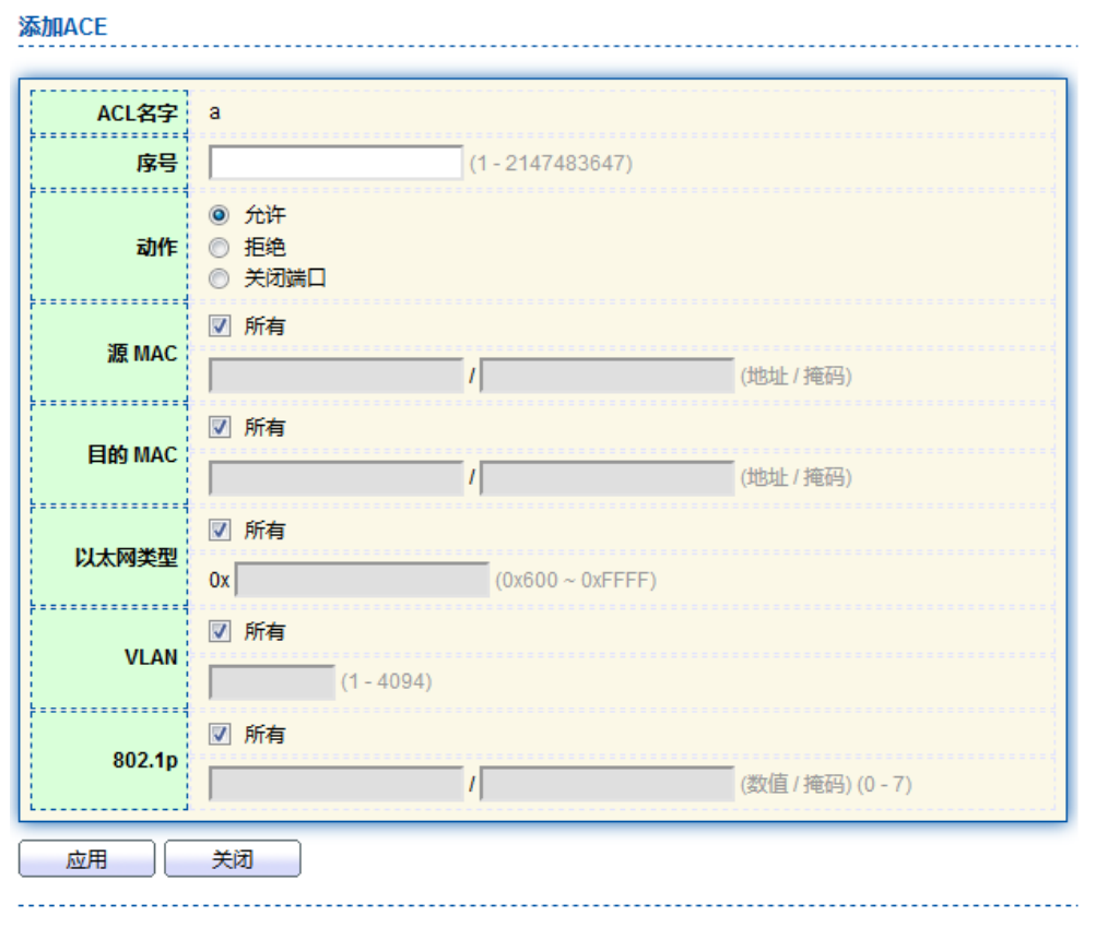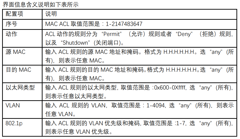 【产品教程】2026.04.15 盒式交换机(千兆)ACL-MAC ACL 配置 二层 ACL:根据源 MAC 地址、目的 MAC 地址、VLAN 优先级、二层协议类型等二层信息制定规则。 操作步骤: 1\. 单击导航树中的“ACL> MAC ACL 配置”菜单,进入“MAC ACL 配置”界面,如下图所示。   2\. 单击导航树中的“ACL > MAC ACE 配置”菜单,选中 ACL 名称,单击“添加”如下图所示:   3\. 填写相应的配置项:   4\. 单击“应用”,完成配置,如图所示。