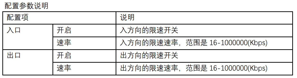 【产品教程】2026.04.15 盒式交换机(千兆)QOS-宽带限速-端口限速 配置接口限速就是限制物理接口向外发送或向内接收数据的速率。在流量从接口发出前,在158接口的出方向上配置限速,对流出的所有报文流量进行控制。在流量从接口接收前,在接口的入方向上配置限速,对流入的所有报文流量进行控制。 操作步骤: 1\. 单击导航栏中“QoS > 带宽限速 > 端口限速”菜单,进入端口限速配置页面,页面中可以选择限速端口,查看当前限速配置,如下图:  2\. 选择需要限速的端口,可以多选,然后点击页面下方的修改按钮,进入修改页面,配置开启和关闭限速功能,指定限速速率,配置完成后应用保存,页面如下: