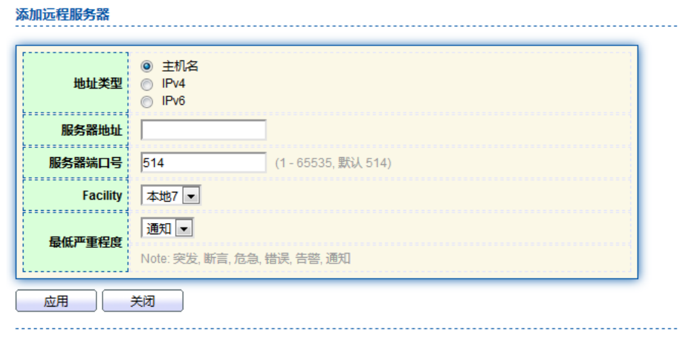 【产品教程】2026.04.15 盒式交换机(千兆)设备诊断-日志功能-功能配置 操作步骤: 1\. 单击导航栏中“设备诊断 > 日志功能 > 功能配置”菜单,进入日志功能配置页面,可以选择开启关闭日志,选择日志输出终端,配置日志严重等级等功能,界面如下:  2\. 单击导航栏中“设备诊断 > 日志功能 > 远程服务器配置”菜单,进入日志远程服务器配置页面,此页面可以添加和查看远程日志服务器配置,界面如下:  3\. 点击添加按钮可以新增远程日志服务器,修改按钮可以修改选中的日志服务器配置,修改完成后,点击“应用”按钮保存。界面如下: