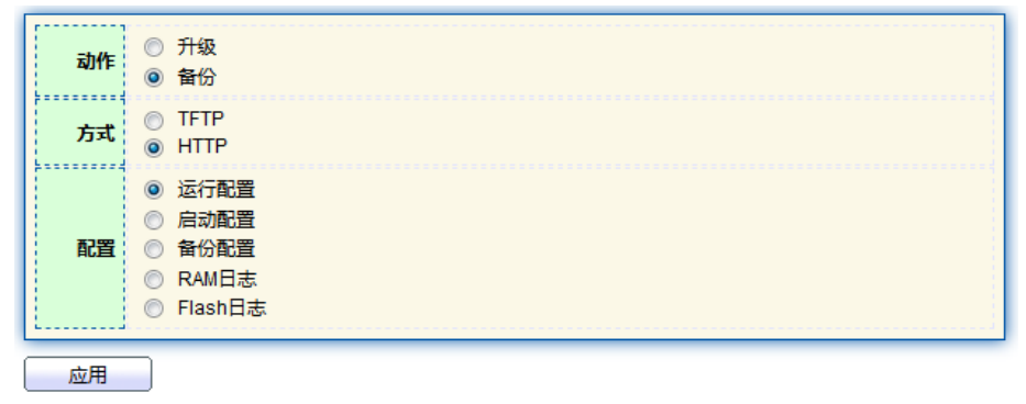 【产品教程】2026.04.15 盒式交换机(千兆) 设备管理-配置管理-升级 1\. 单击导航树中的“设备管理 > 配置管理 > 升级”菜单,进入“升级/备份”界面,如下图所示。  2\. 升级配置文件操作步骤, 勾选“升级”,选项升级方式“TFTP”或“HTTP”,选择需要升级的配置文件(TFTP 方式需要填写相应服务器),选择相应的配置文件。单击“应用“,如下图所示。  3\. 备份配置文件操作步骤, 选择“备份”,选项下载方式“TFTP”或“HTTP”,选择需要下载的配置文件或者日志(TFTP 方式需要填写相应服务器)。单击“应用”,如下图所示。