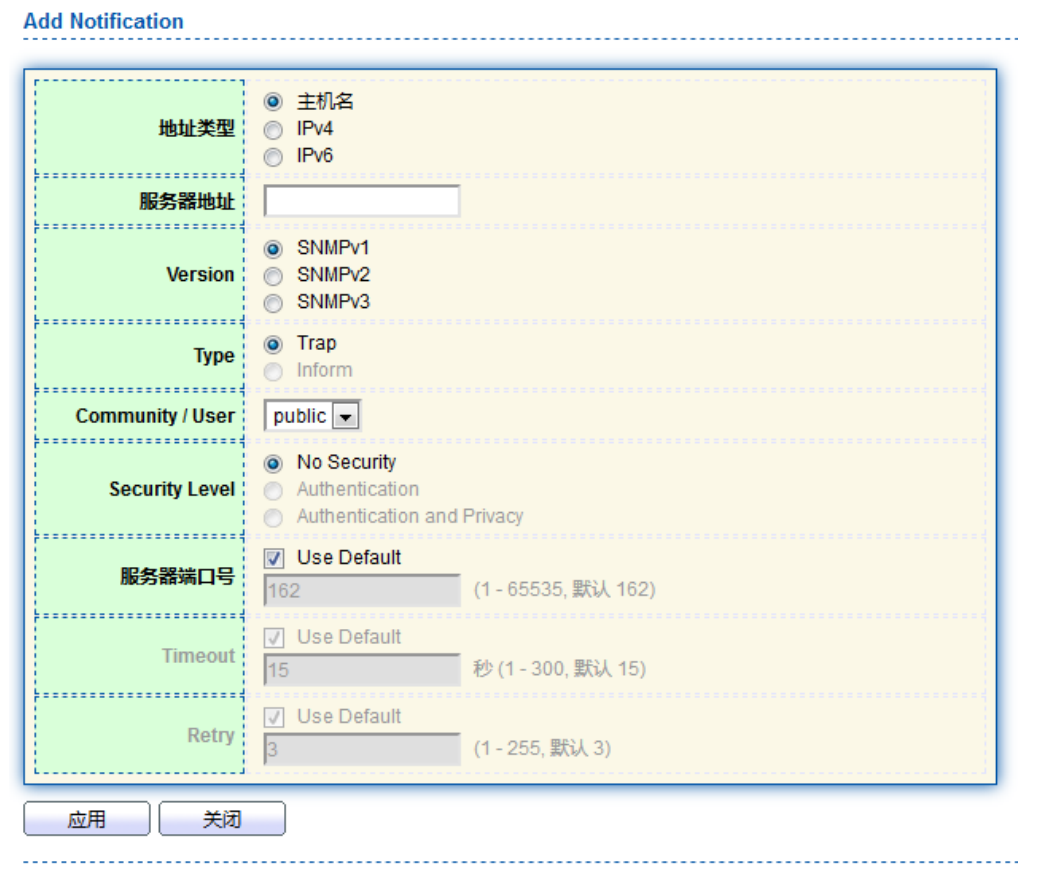 【产品教程】2026.04.15 盒式交换机(千兆) 设备管理-SNMP 配置-Notification 配置 1\. 单击导航树中的“设备管理 > SNMP 配置 > Notification 配置”菜单,进入“Notification配置”界面,如下图所示。   2\. 单击“添加”,填写相应配置,单击“应用”,完成配置。