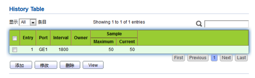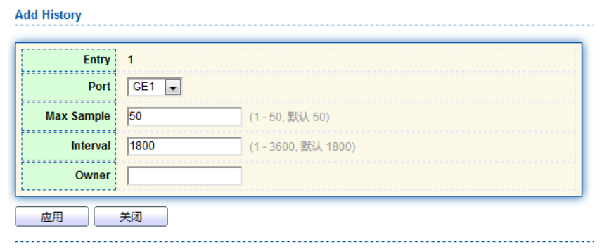 【产品教程】2026.04.15 盒式交换机(千兆) 设备管理-历史配置 配置了 RMON 历史组以后,以太网交换机会周期性地收集网络统计信息,为了便于处理,这些统计信息被暂时存储起来,提供有关网段流量、错误包、广播包、带宽利用率等统计信息的历史数据。 利用历史数据管理功能,可以对设备进行设置。设置的任务包括:采集历史数据、定期采集并保存指定端口的数据。 操作步骤 1\. 单击导航树中的“设备管理 > RMON 配置 > 历史配置”菜单,进入“历史配置”界面,如下图所示。   2\. 点击“添加”,进入历史组配置页面,填写相应的配置项。  3\. 单击“应用”,完成配置,如下图所示。