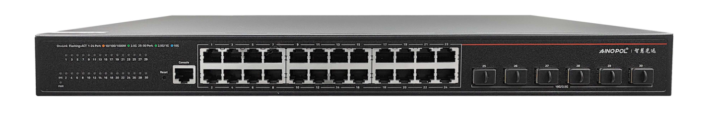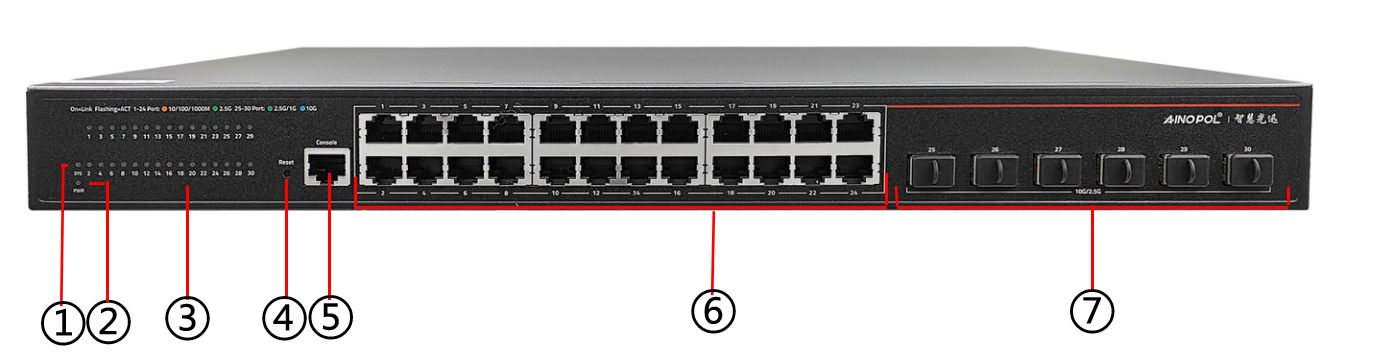 盒式交换机硬件说明 设备型号:24口三层2.5G云管理交换机 24个100/1000/2.5GBase-T RJ45端口 6个1000/10GBase-X SFP+光口 背板带宽336Gbps/2.6Tbps 包转发率228Mpps/342Mpps MAC地址表32K 功耗:≤35W AC 100-240V/50-60Hz 产品尺寸:440\*280\*44mm 净重:3.5KG 工作温度:-10℃~50℃ 产品外观及硬件规格说明:  图1 ZH-CS5530TGX-SI产品正面  图2 ZH-CS5530TGX-SI产品背面 1、接口说明  ①:SYS指示灯:系统运行指示灯 ②:PWR指示灯:设备电源指示灯 ③:设备接口指示灯:设备网络接口指示灯 ④:Reset键:复位键 ⑤:CONSOLE接口:是一种典型的配置接口,用于服务器后台命令行管理。通过使用Console线直接连接至计算机的串口。 ⑥:网络接口:24个100/1000/2500M 自适应RJ45网口 ⑦:网络接口:6个SFP+光口  ⑧:接地 ⑨:电源接口:需接入AC 220V 电源。