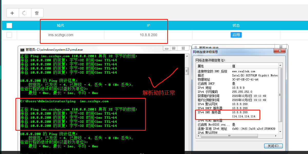 【产品教程】-基础 2025.12.03 系统设置-DNS服务 '环境说明' 系统版本:C01V02R003P230414 服务器自身IP地址:10.8.8.200 此功能针对DNS解析, 例如下面的终端想请求“ims.sczhgx.com”解析为:10.8.8.200 1:先配置DNS服务将 需要解析的域名和解析成功的IP地址贴出来  2:配置DNS服务器,将 10.8.8.200 添加上  3:将内网的网关,和DNS分配成:10.8.8.200 4:剩下的就在终端里面去 获取IP地址,和DNS, 去ping域名分析了