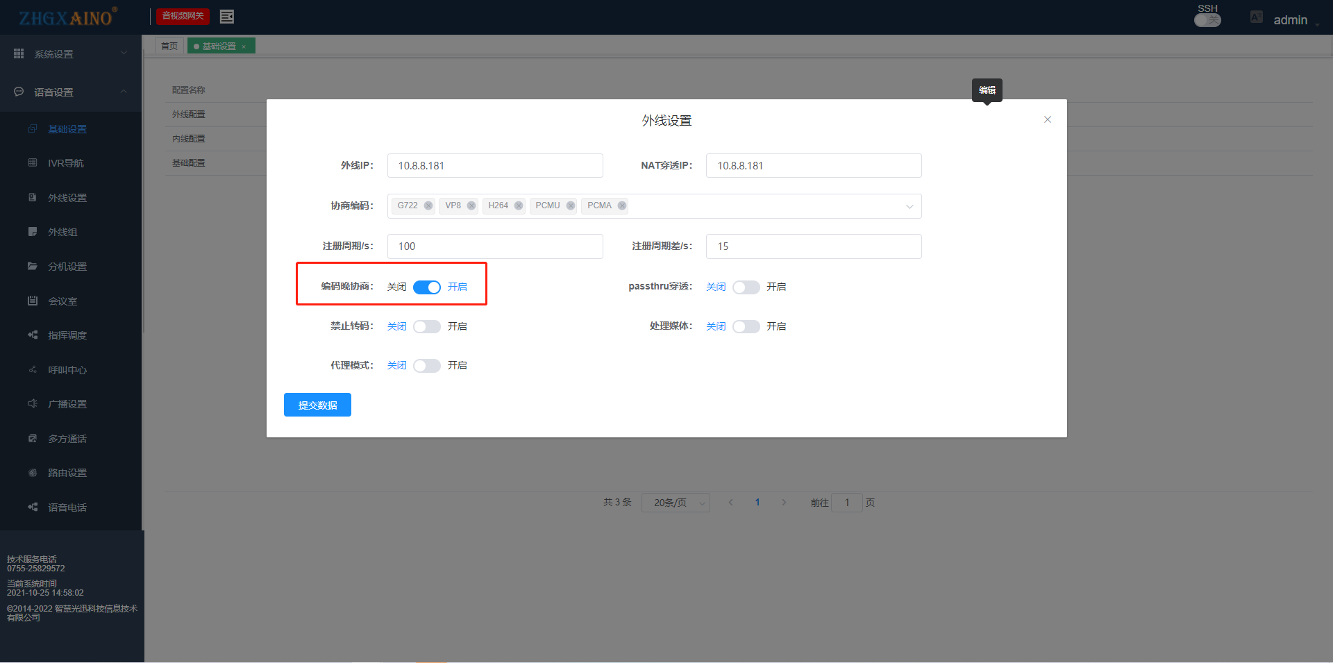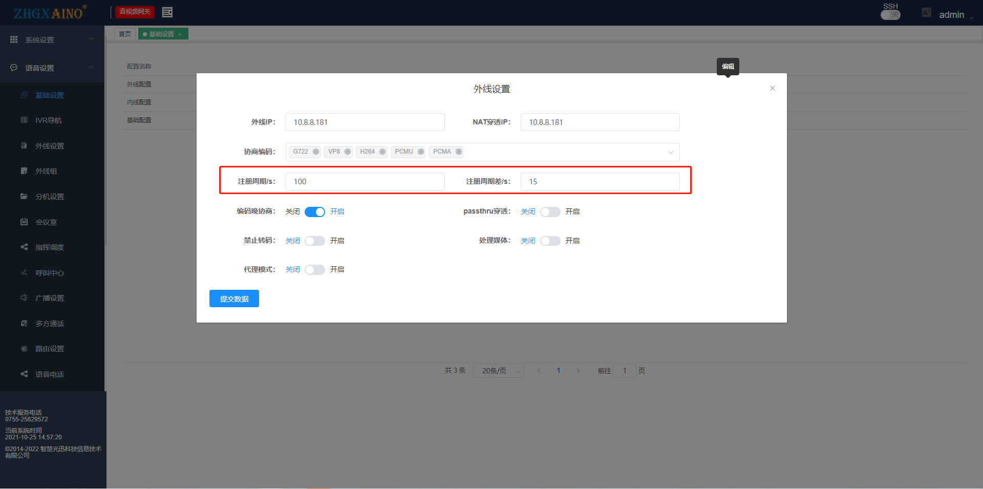 【产品教程】-基础 2025.12.03 AVG 语音设置-基础设置 基础设置  1.外线配置 外线IP与NAT穿透IP一致并且设置能和落地网关通信的IP  编码协商,默认全选  注册周期设置  晚编码协商默认开启  2.内线配置 内线IP:设定内线SIP服务器地址 NAT穿透IP:设定内线SIP服务器地址相同的IP